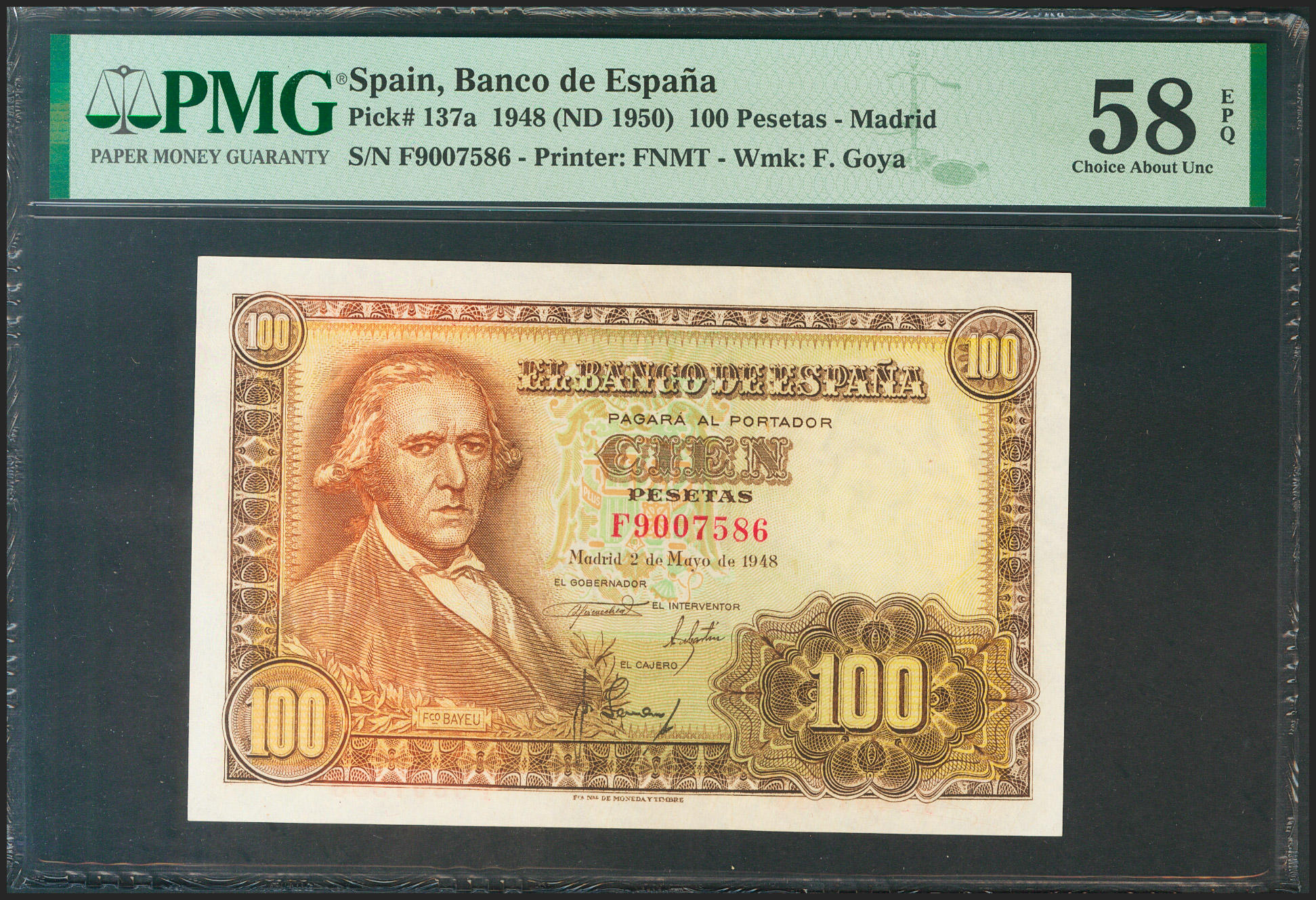 100 Pesetas. 2 de Mayo de 1948. Serie F. (Edifil 2021: 456a, Pick: 137a). Apresto original. EBC+++. Encapsulado PMG58EPQ.