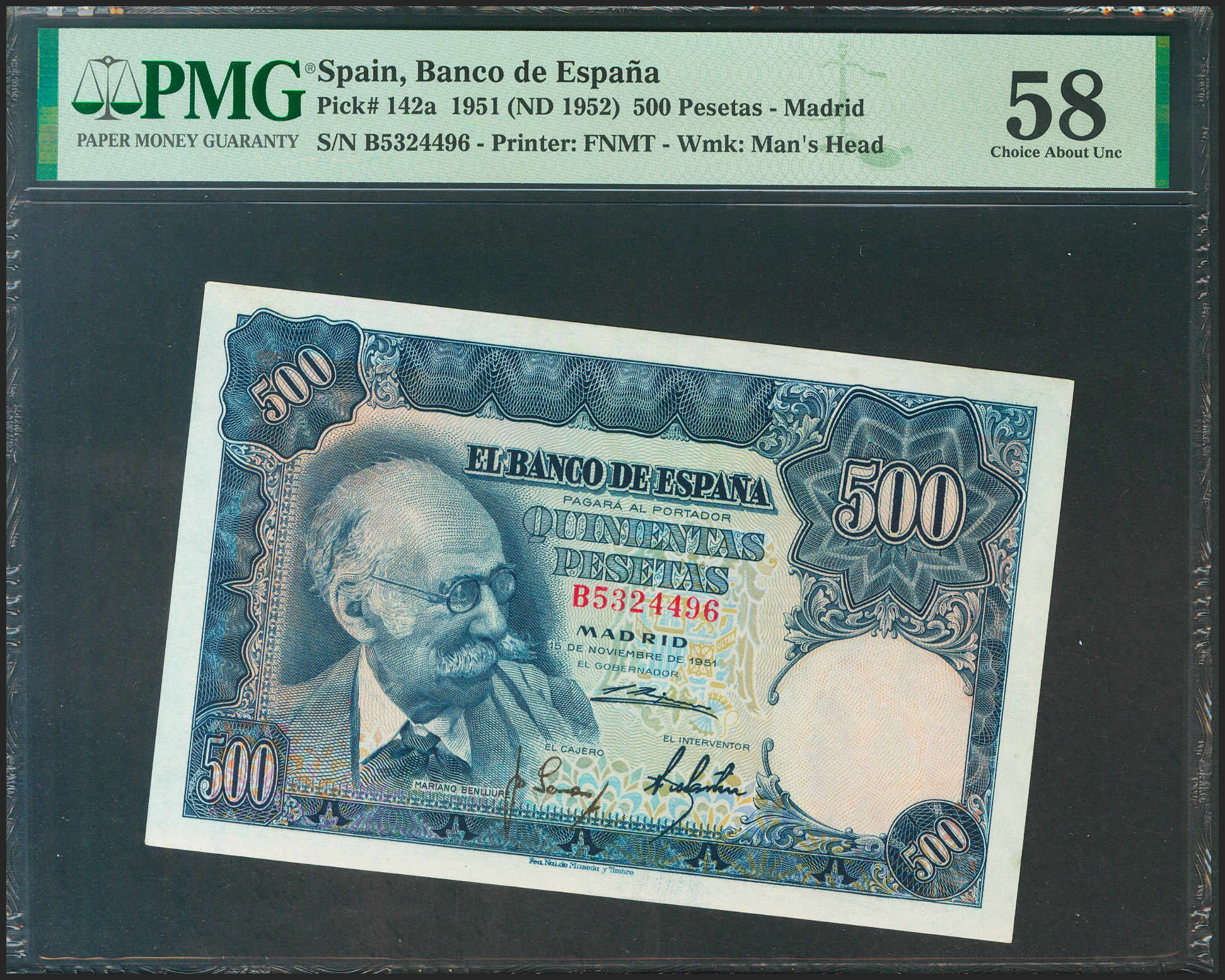 500 Pesetas. 15 de Noviembre de 1951. Serie B. (Edifil 2021: 460a, Pick: 142a). Inusual en esta calidad. EBC++. Encapsulado PMG58.