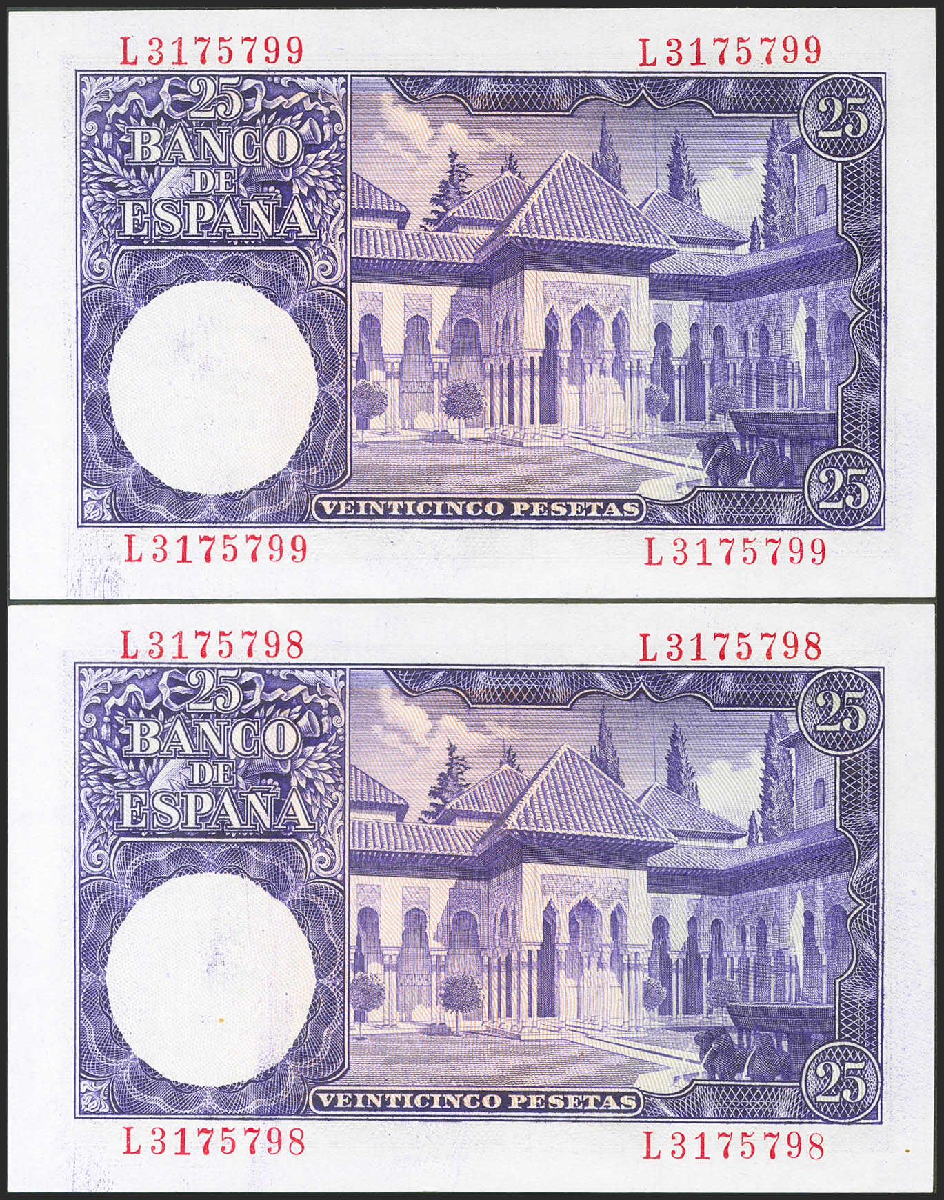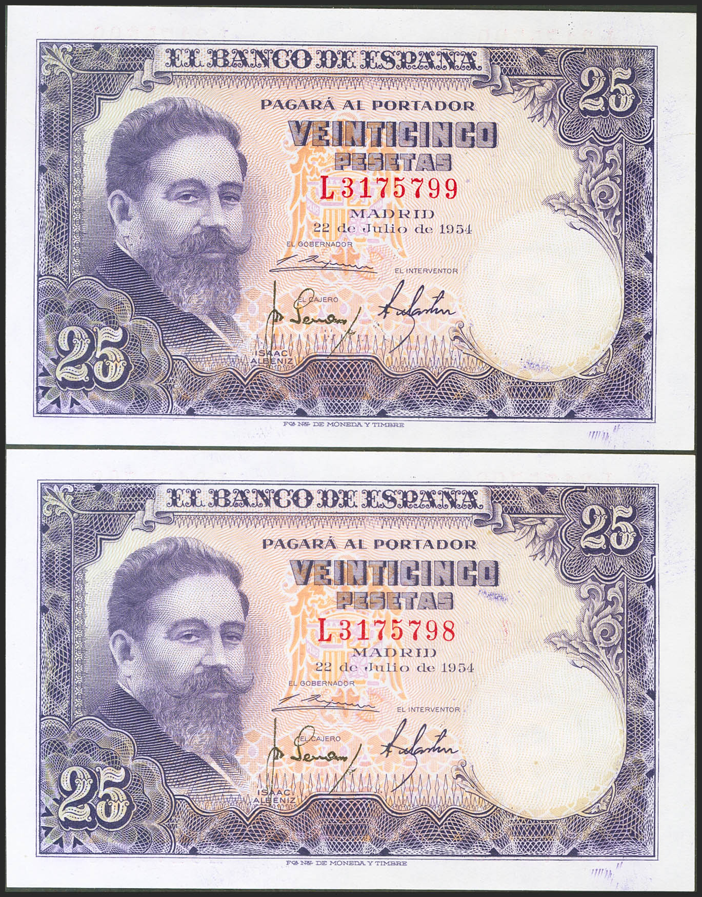 25 Pesetas. 22 de Julio de 1954. Pareja correlativa. Serie L. (Edifil 2021: 467a). Apresto original. SC-.