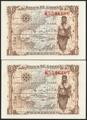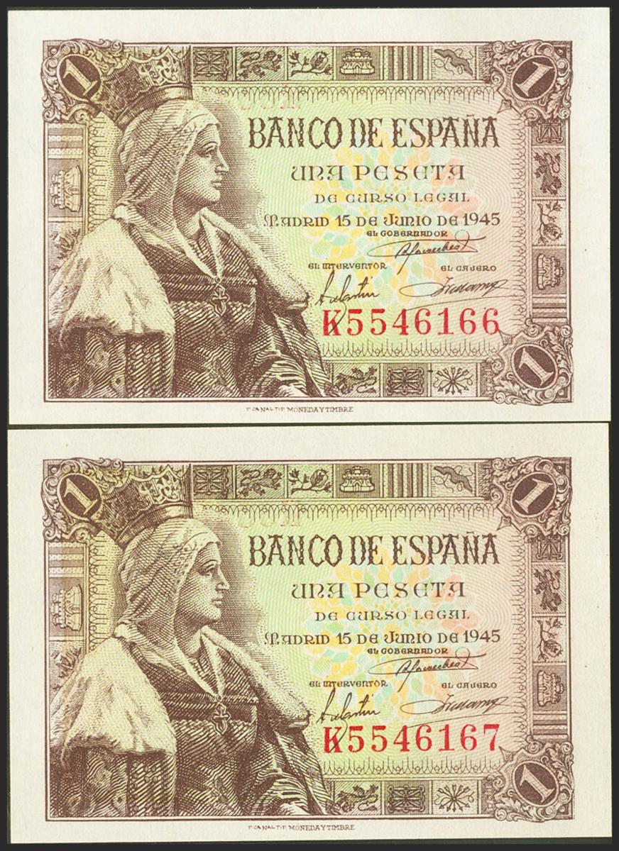 1 Peseta. 15 de Junio de 1945. Pareja correlativa. Serie K. (Edifil 2021: 448a). Apresto original. SC.
