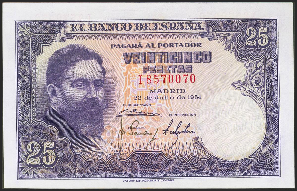 25 Pesetas. 22 de Julio de 1954. Serie I. (Edifil 2021: 467a). Conserva todo su apresto original. SC.