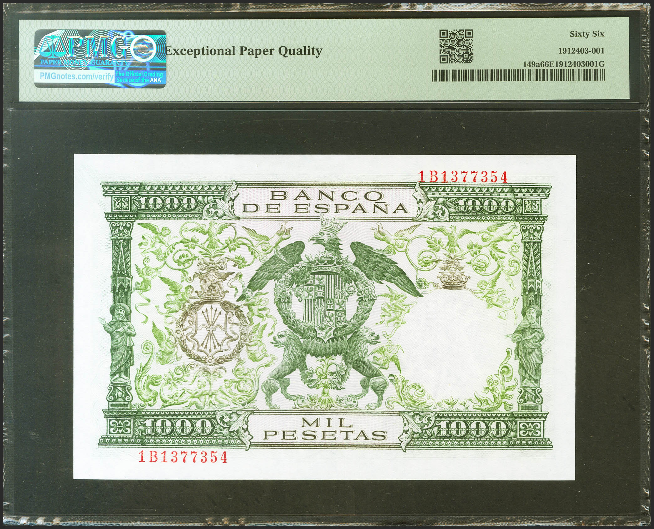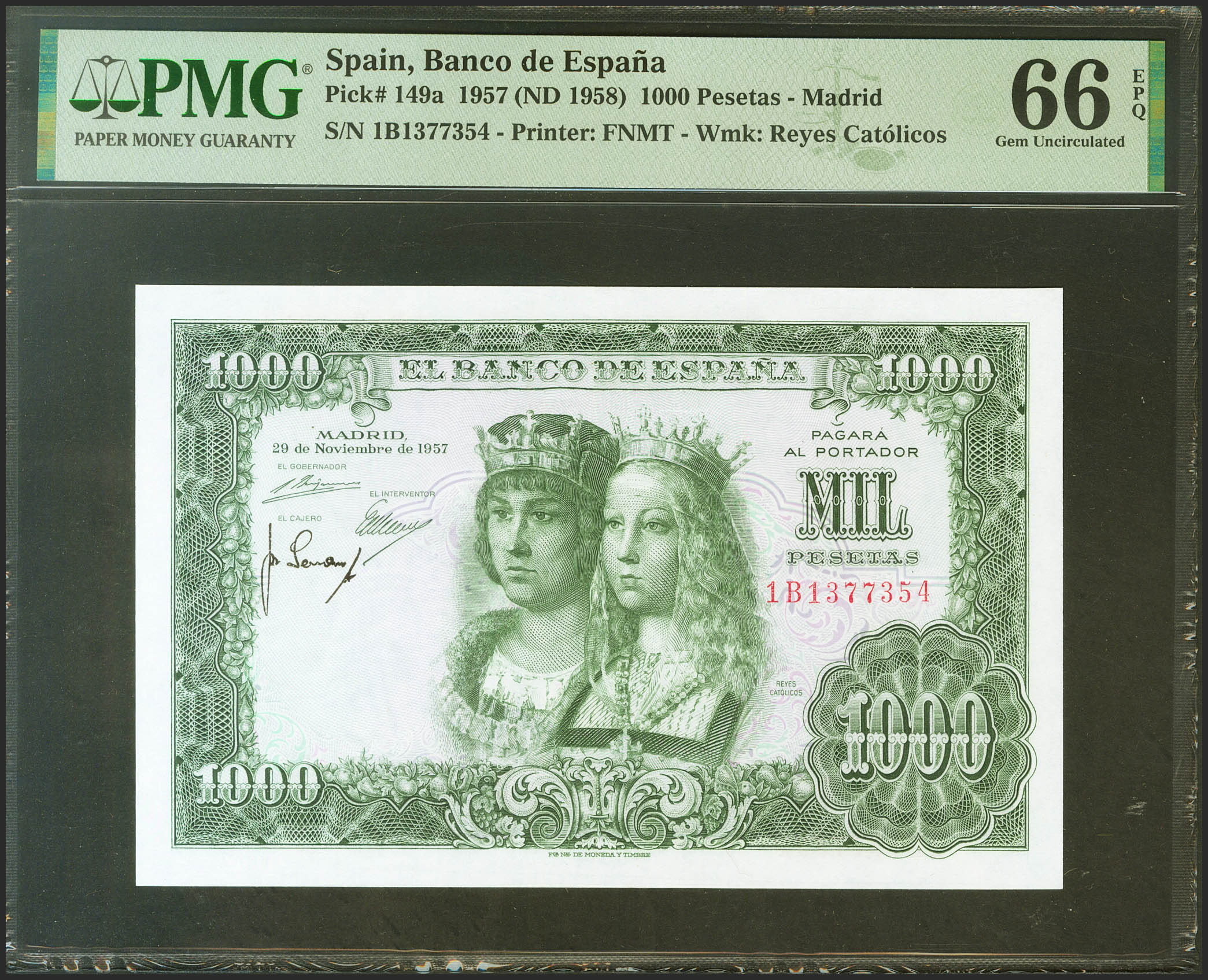 1000 Pesetas. 29 de Noviembre de 1957. Serie 1B. (Edifil 2021: 469b, Pick: 149a). Muy raro en esta excepcional calidad, apresto original. SC. Encapsulado PMG66EPQ.