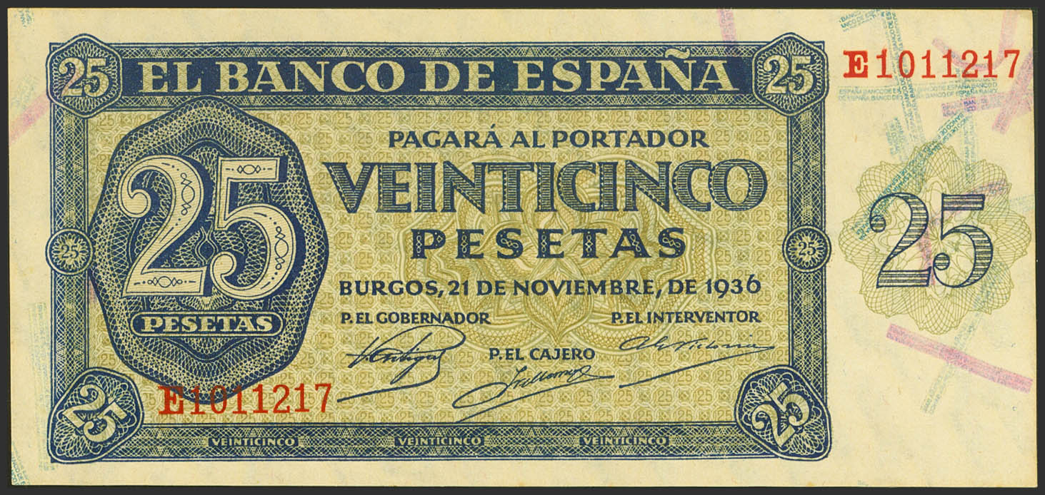 25 Pesetas. 21 de Noviembre de 1936. Serie E. (Edifil 2021: 419a). Conserva todo su apresto original. EBC+++.