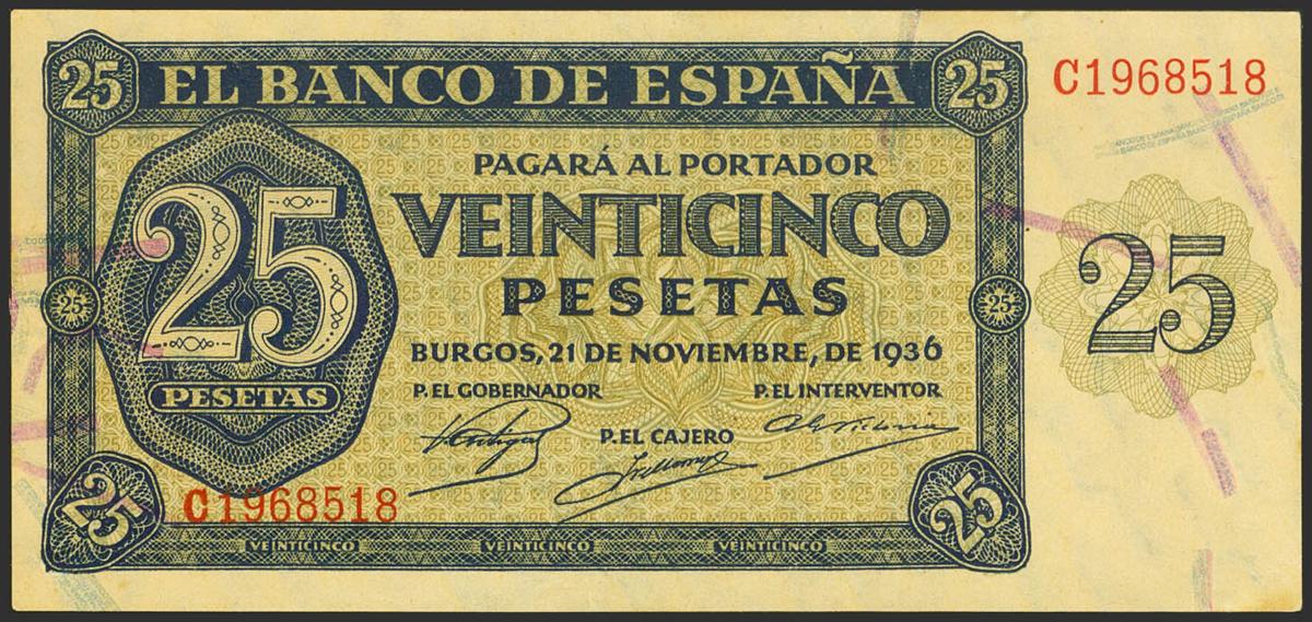25 Pesetas. 21 de Noviembre de 1936. Serie C. (Edifil 2017: 419a). Conserva su apresto original, presenta leve ondulación vertical que no rompe fibra. EBC+++.