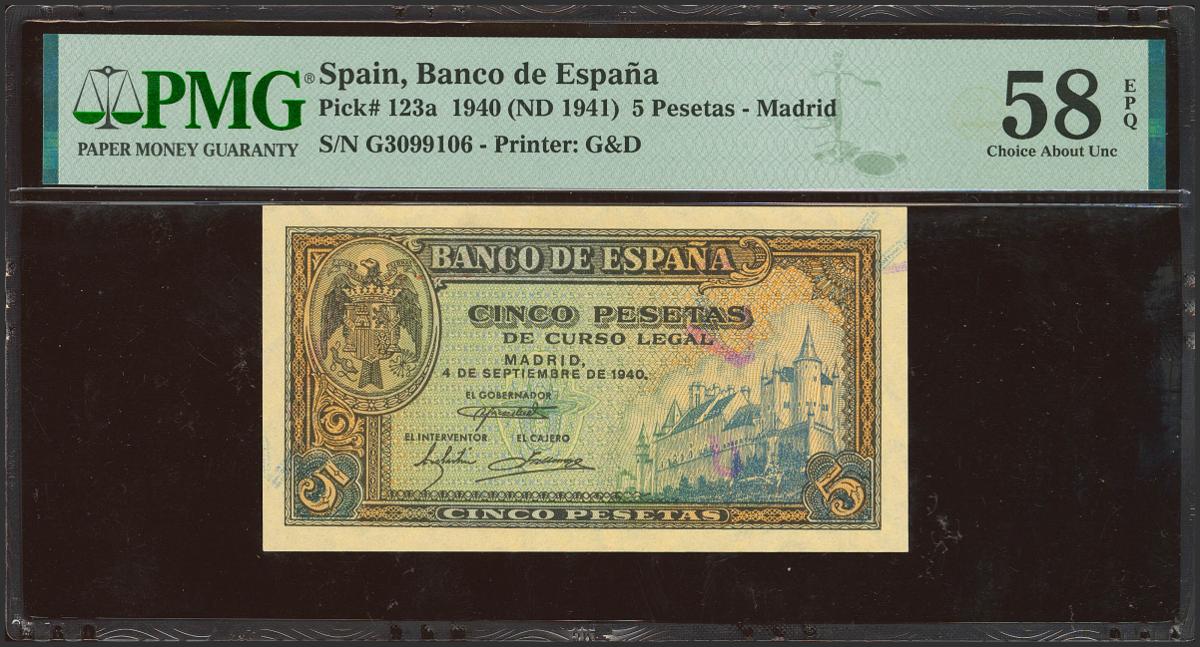 5 Pesetas. 4 de Septiembre de 1940. Serie G. (Edifil 2021: 443a, Pick: 123a). EBC+++. Apresto original. Encapsulado PMG58EPQ.