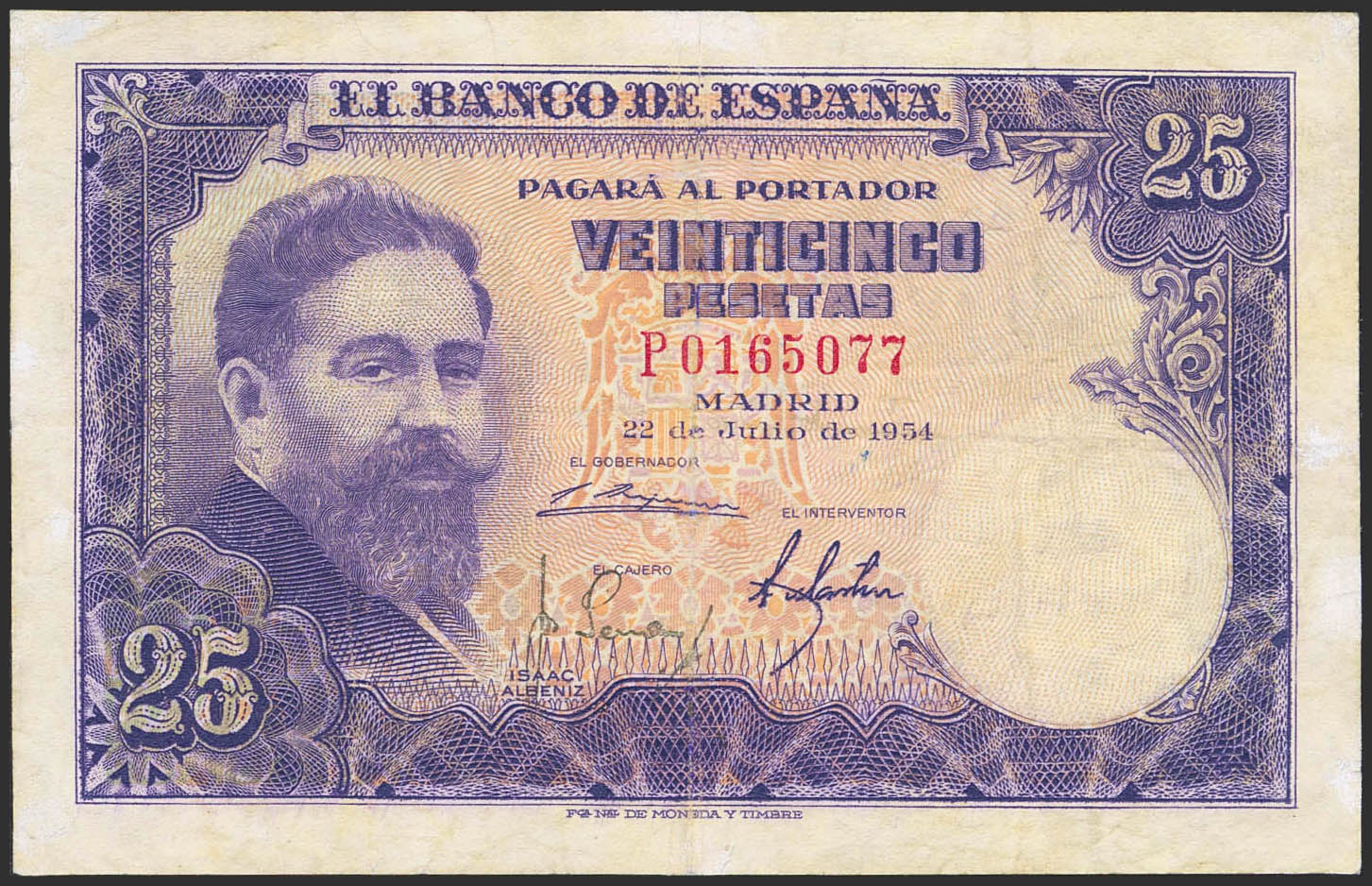 25 Pesetas. 22 de Julio de 1954. Serie P, última serie. (Edifil 2021: 467b). Reparado. MBC-.