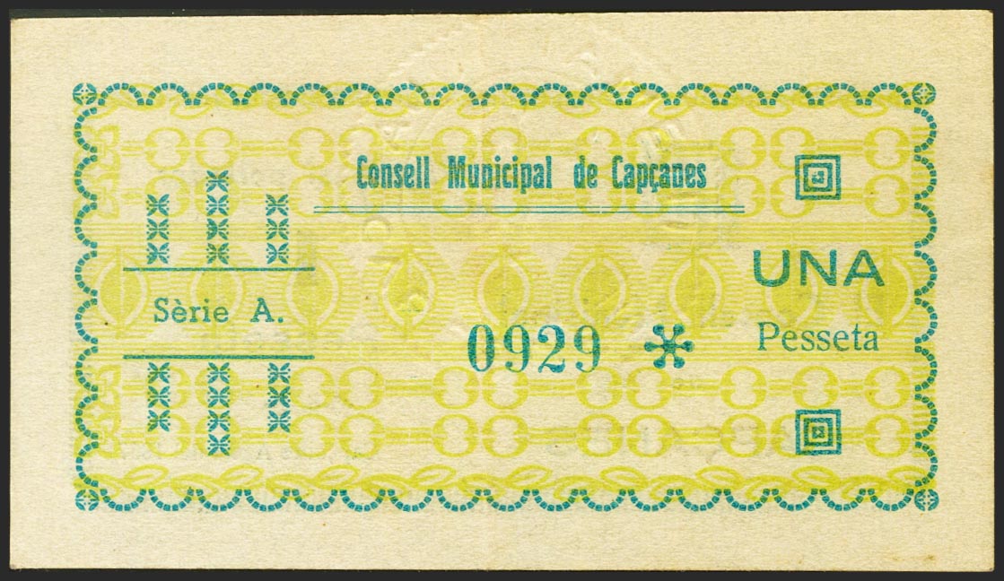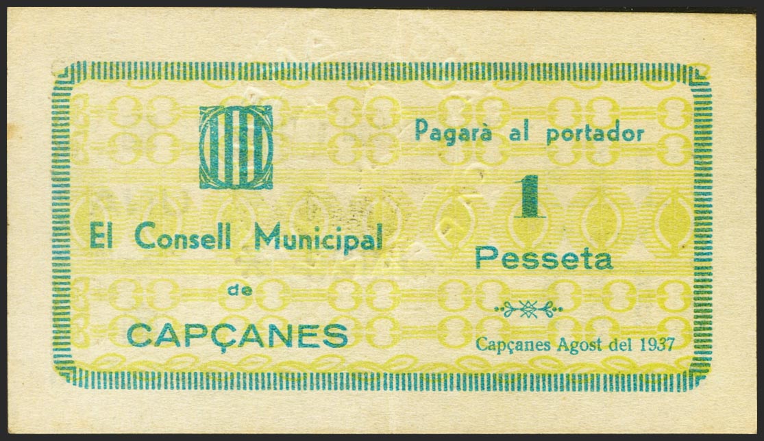 CAPÇANES (TARRAGONA). 1 Peseta. Agosto 1937. Serie A. (González: 7368). Raro. EBC.