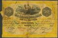 50 Pesos. 1869. Banco Español de la Habana, emisión de Nueva York. Falso de época, con diferentes estampaciones de la marca FALSO, tanto en anverso como en reverso. Serie 3ª. (Pick: 14, Edifil 2021: 25, EchenagusÃa: 15). Extraordinariamente raro, para hacernos idea de la rareza de este ejemplar, desde que existen registros de subastas en internet únicamente se ha subastado un billete falso de época similar y sólo otro billete original, billete reforzado debido a la tropicalización del papel, es muy habitual este tipo de actuaciones sobre billetes cubanos del siglo XIX. BC.