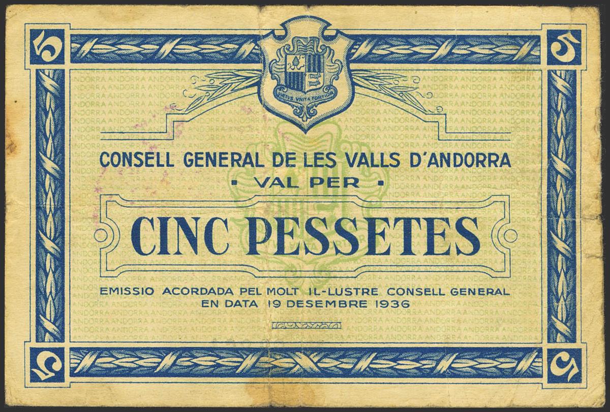 ANDORRA. 5 Pessetes. 19 de Diciembre de 1936. Sin serie. (Edifil 2021: 6, Pick: 3). RarÃsimo. MBC.