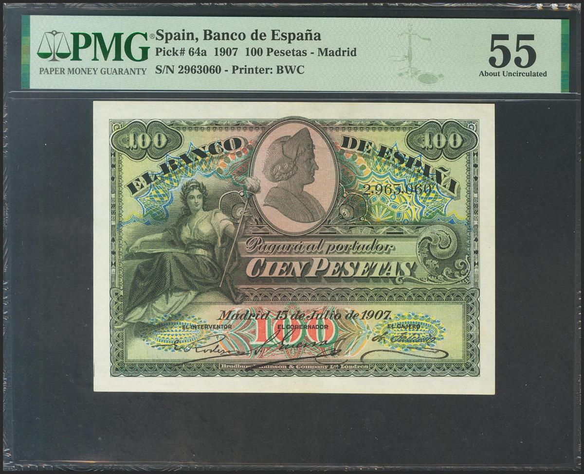 100 Pesetas. 30 de Junio de 1906. Serie B. (Edifil 2023: 313a, Pick: 59a). Apresto original. EBC++. Encapsulado PMG55EPQ.