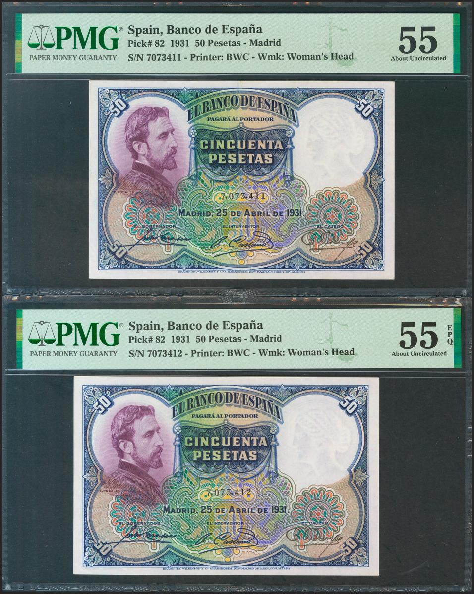 50 Pesetas. 25 de Abril de 1931. Pareja correlativa. Sin serie. (Edifil 2021: 359, Pick: 82). Rarísima, especialmente en esta calidad y con apresto original. SC. Encapsulado PMG65EPQ, ambos.