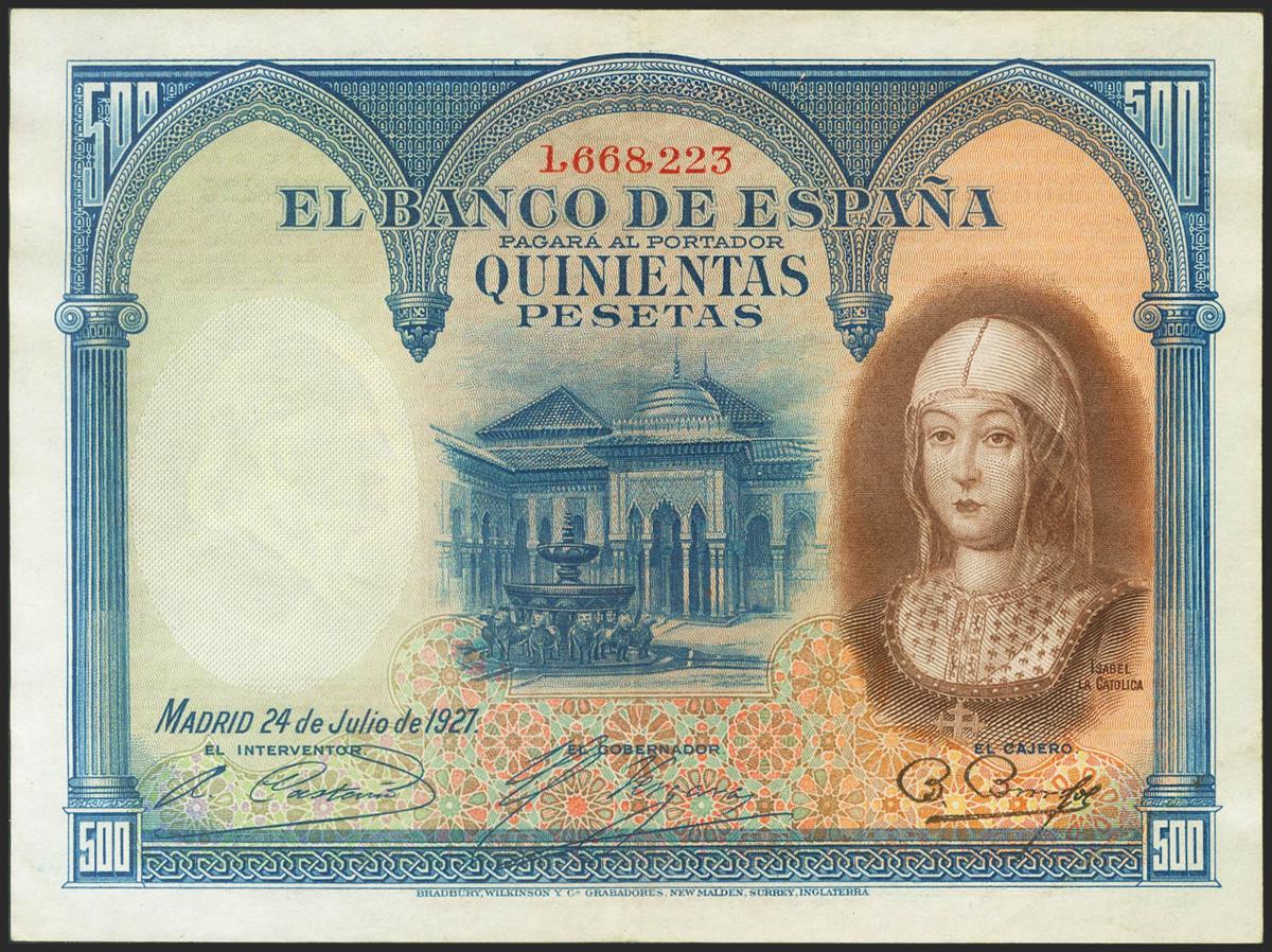 500 Pesetas. 24 de Julio de 1927. Sin serie y numeración posterior a 1602000. (Edifil 2021: 352). Inusual, presenta gran parte del apresto original. EBC+.