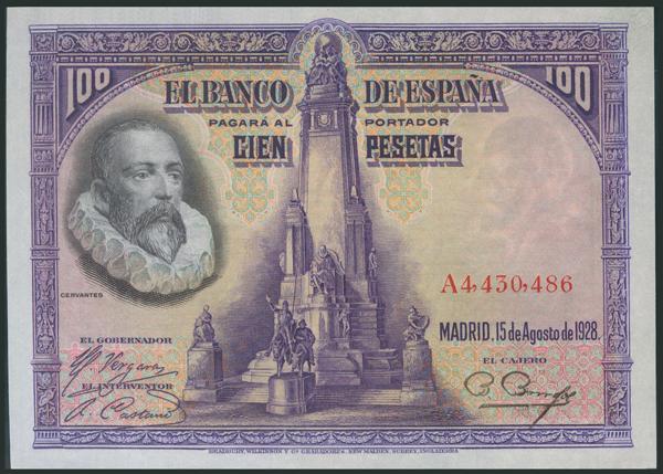 100 Pesetas. 15 de Agosto de 1928. Pareja correlativa. Serie A. (Edifil 2017: 355a). Conserva todo su apresto original. EBC+.