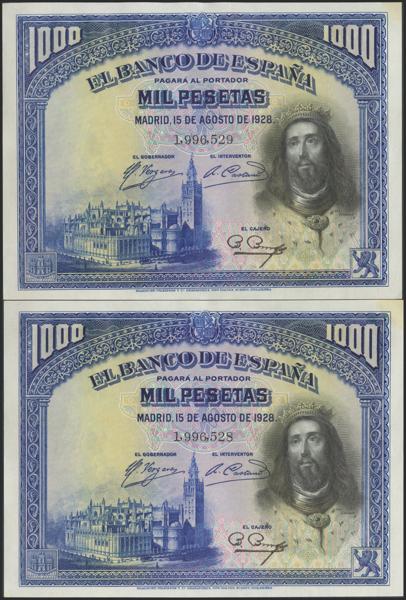 1000 Pesetas. 15 de Agosto de 1928. Pareja correlativa. Sin serie. (Edifil 2017: 357). Conserva todo su apresto original. SC-.