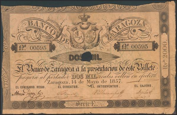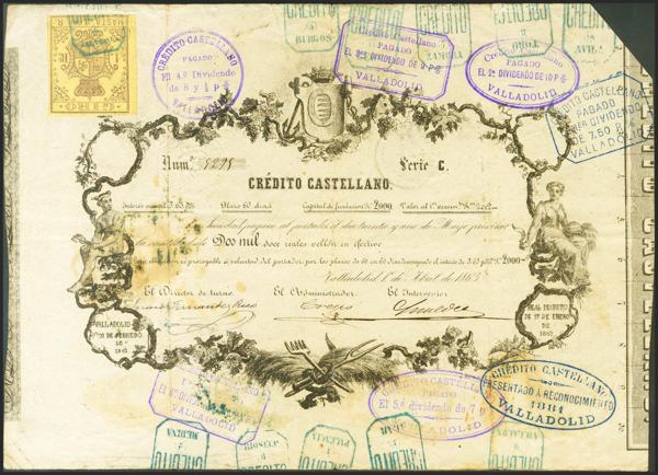 CREDITO CASTELLANO. 2000 Reales de Vellón. 31 de Agosto de 1865. Serie A y diversas marcas de uso interno del Banco de Valladolid. Rarísimo. Para entender mejor la contextualización de este billete recomendamos la obra "Obligaciones, vales y documentos puestos en circulación como papel moneda en España", de Don Ramón Cobo Huici. EBC.