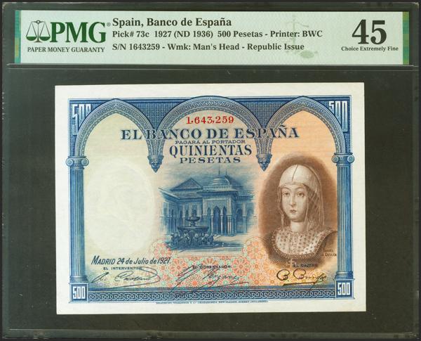 500 Pesetas. 24 de Julio de 1927. Sin serie y numeración posterior a 1602000. (Edifil 2017: 352). Muy raro en esta conservación. EBC+. Encapsulado PMG55.