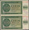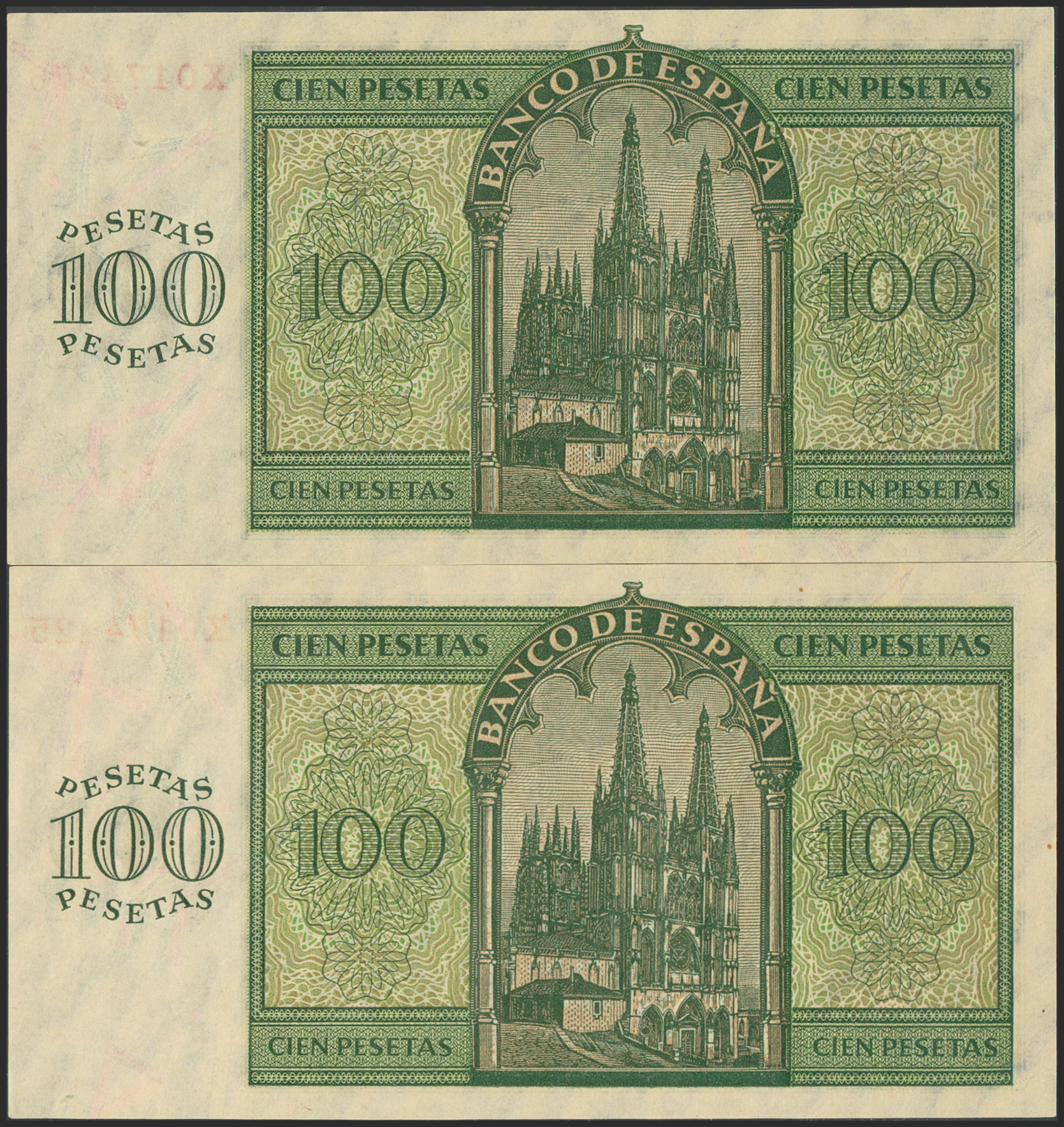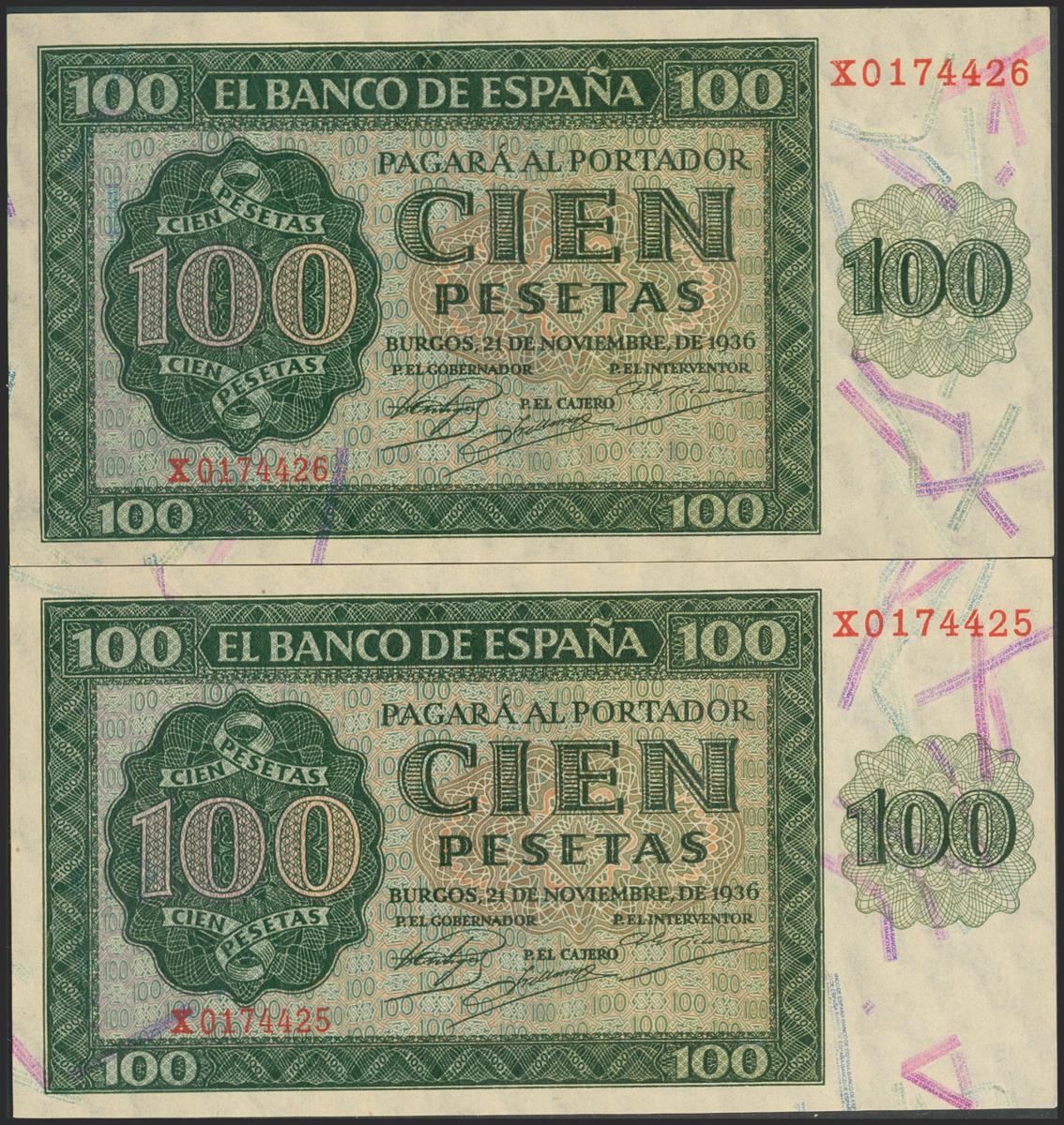 100 Pesetas. 21 de Noviembre de 1936. Pareja correlativa. Serie X, última serie emitida. (Edifil 2017: 421a). Raro asÃ. SC-.