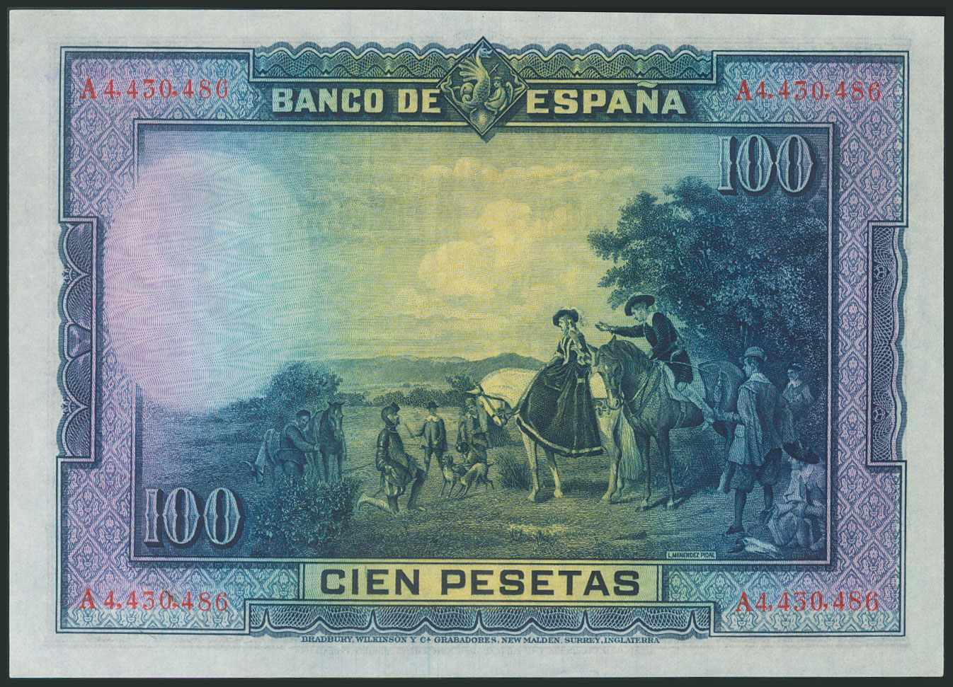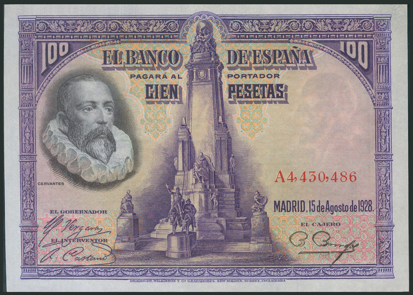 100 Pesetas. 15 de Agosto de 1928. Serie A. (Edifil 2017: 355a). Conserva todo su apresto original. SC-.