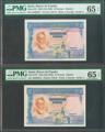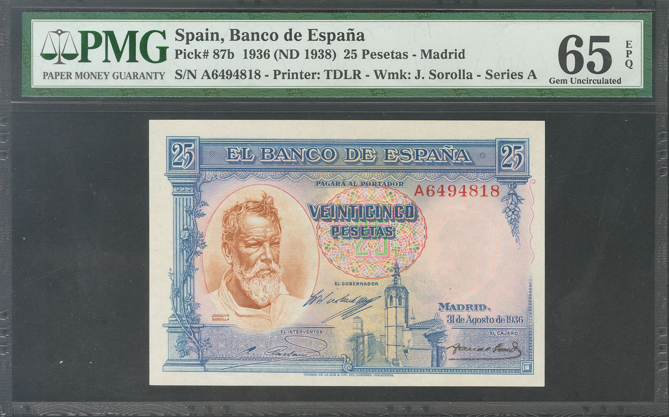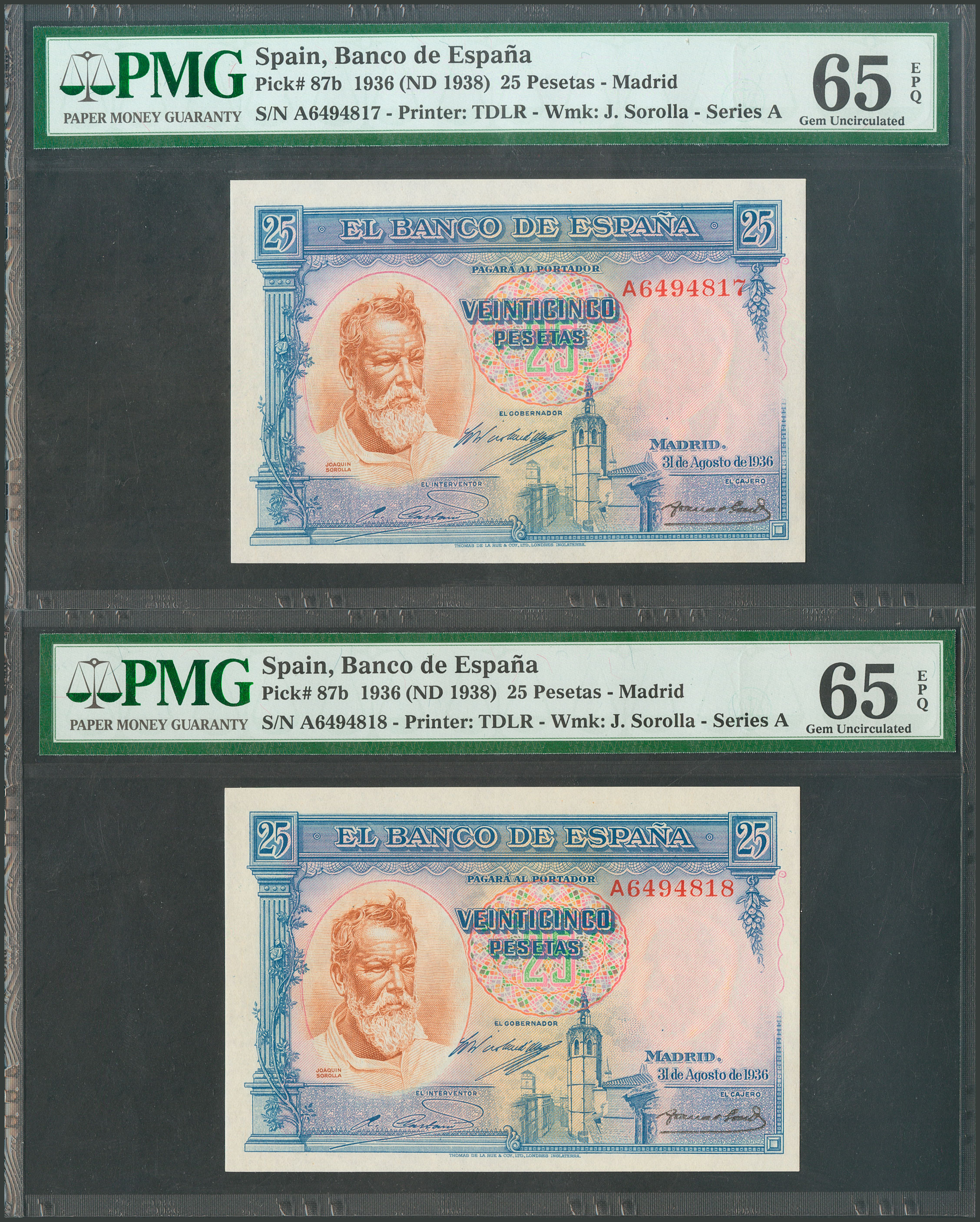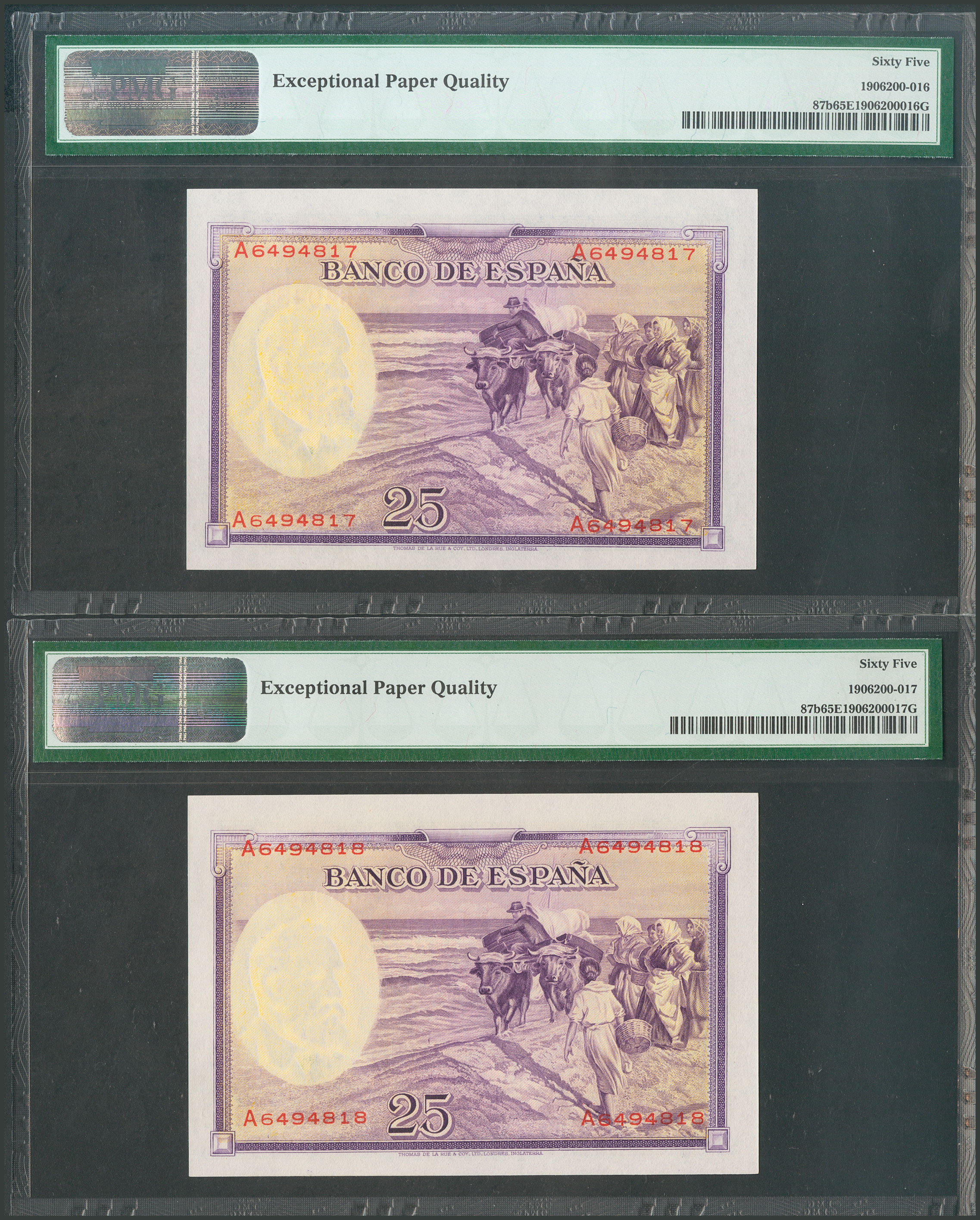 25 Pesetas. 31 de Agosto de 1936. Pareja correlativa. Serie A. (Edifil 2017: 367a). Apresto original e inusual. SC. Encapsulado PMG65EPQ, ambos.
