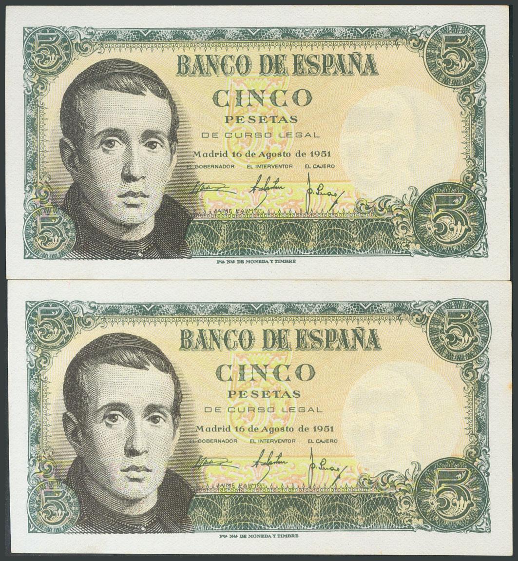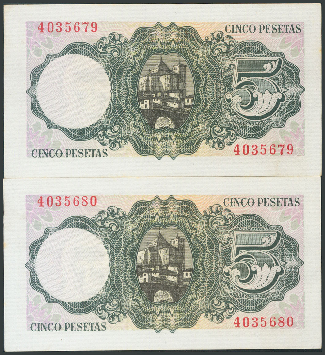 5 Pesetas. 16 de Agosto de 1951. Pareja correlativa. Sin serie. (Edifil 2017: 459). Inusual y apresto original, imperceptible puntito del tiempo. SC-.