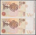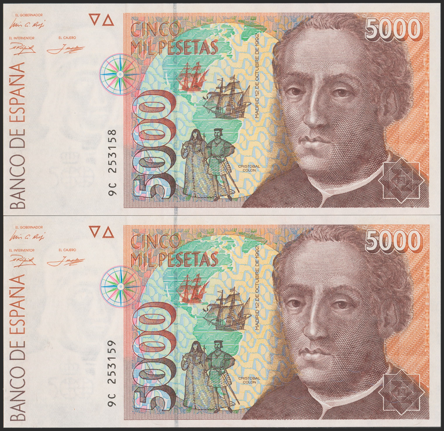 5000 Pesetas. 12 de Octubre de 1992. Pareja correlativa. Serie 9C, numeración especial. (Edifil 2017: 484c). Ondulación natural propia del proceso de impresión, sin importancia alguna.SC-.
