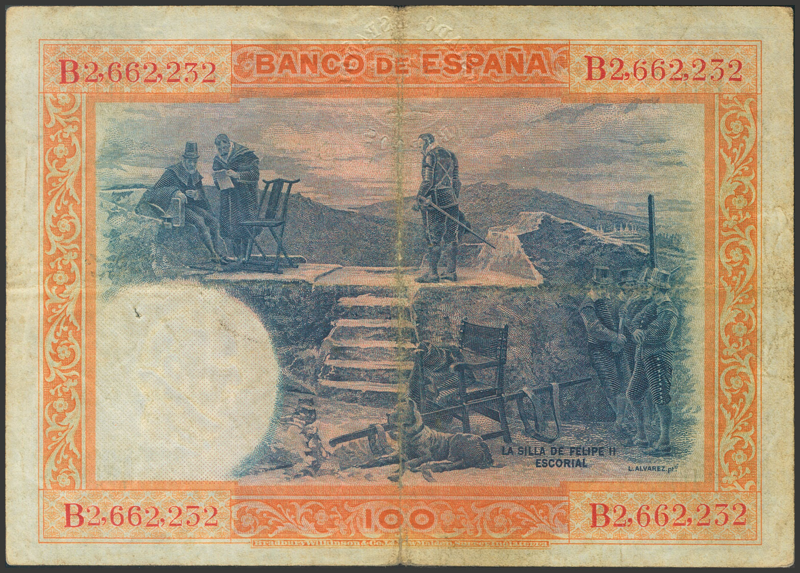 100 Pesetas. 1 de Julio de 1925. Sello en seco "Estado Español, Burgos". Serie B. (Edifil 2017: 410). MBC.