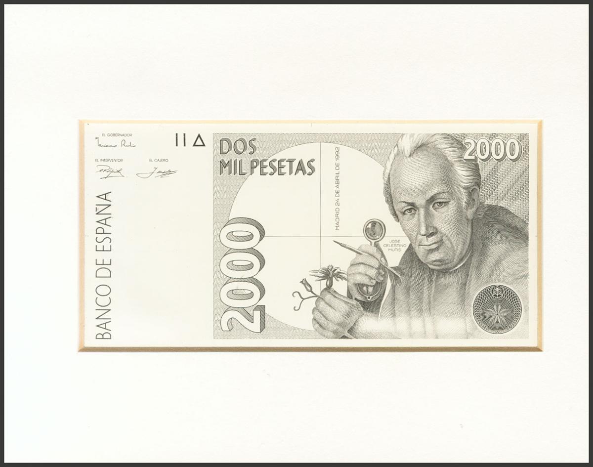 Prueba calcográfica sin numeración y en negro del anverso del billete de 2000 Pesetas emitido el 24 de Mayo de 1992. (Edifil 2017: 482P). Muy rara y verdaderamente espectacular. SC.