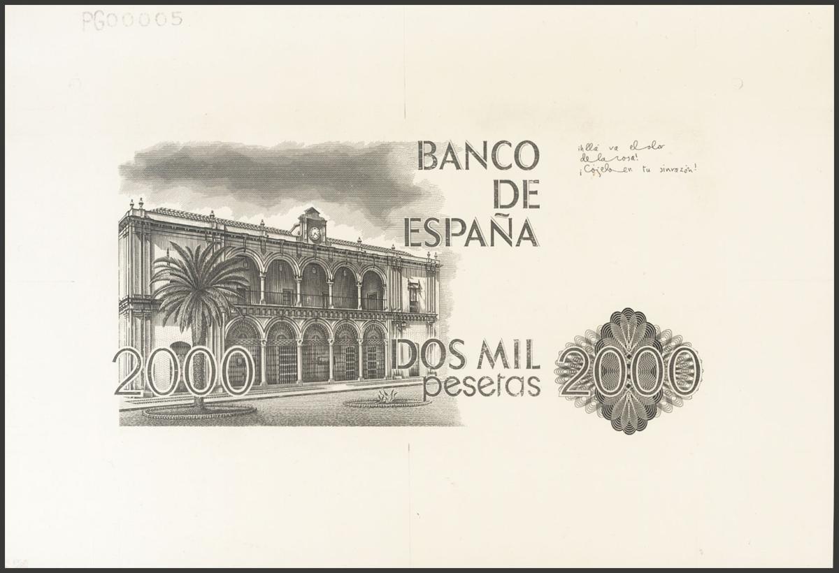 Prueba de anverso del billete de 2000 Pesetas emitido el 22 de Julio de 1980. (Edifil 2017: 479Pa). Rara y espectacular prueba.
