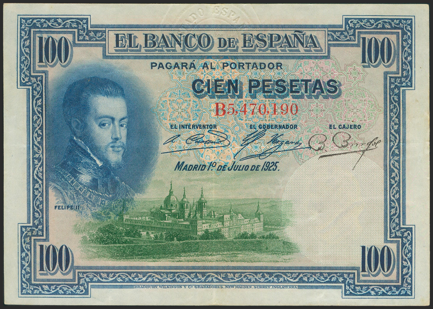 100 Pesetas. 1 de Julio de 1925. Serie B y sello en seco ESTADO / ESPAÑOL. (Edifil 2021: 323a). Conserva gran parte del apresto original. MBC+.