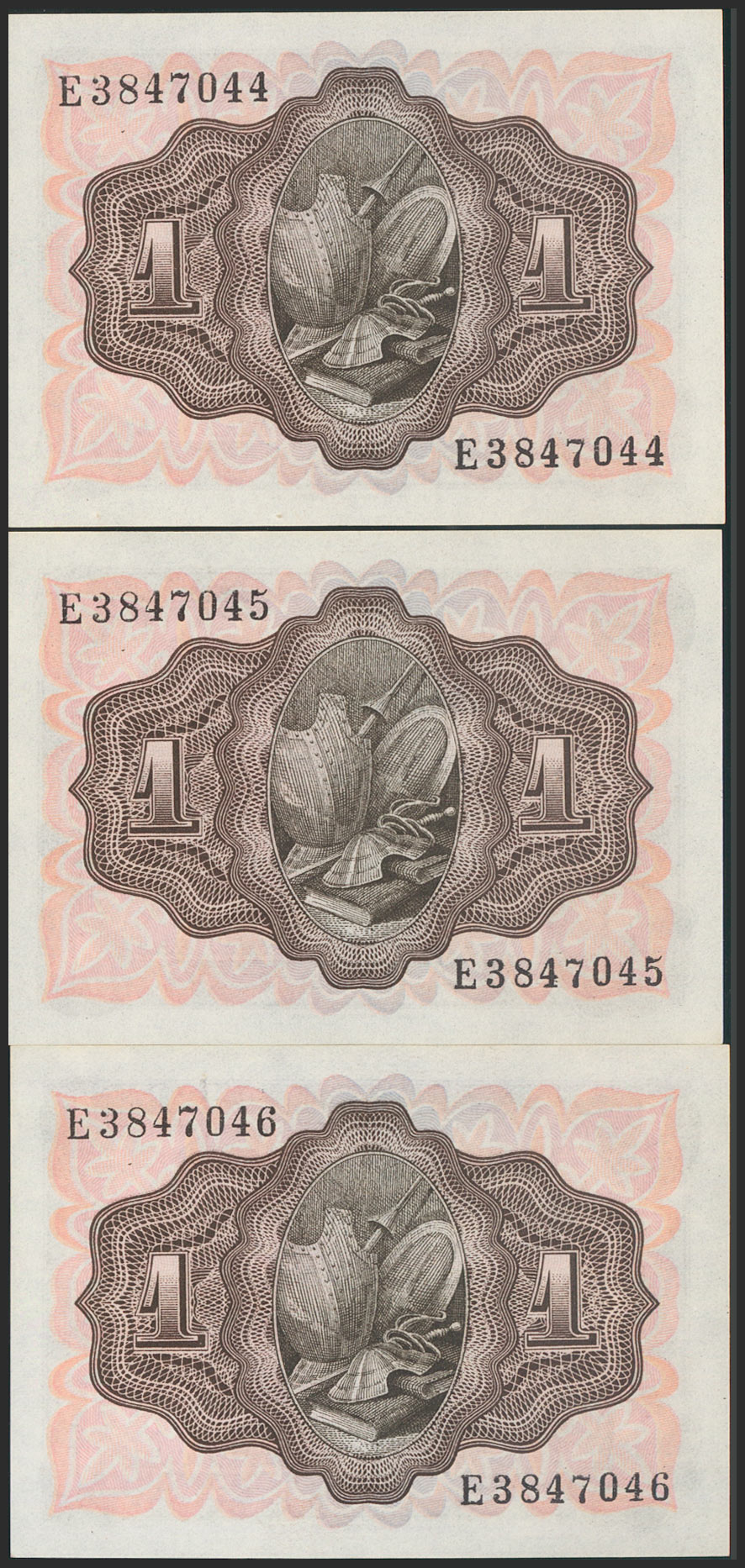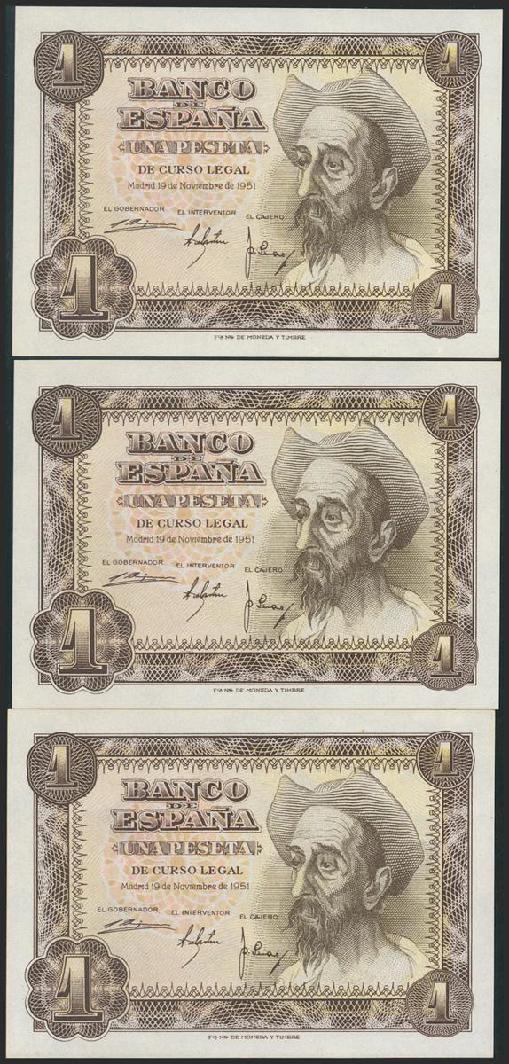 1 Peseta. 19 de Noviembre de 1951. TrÃo correlativo. Serie E. (Edifil 2021: 461a). Apresto original. SC.