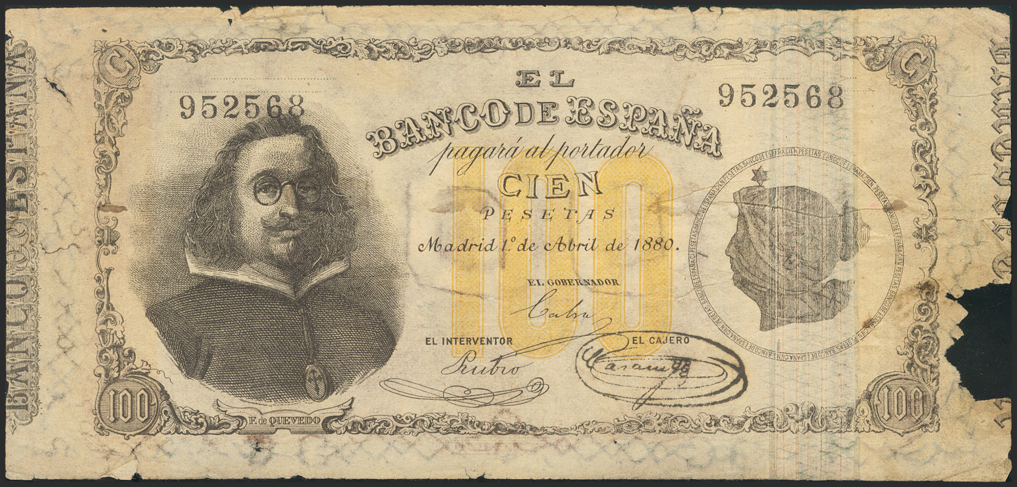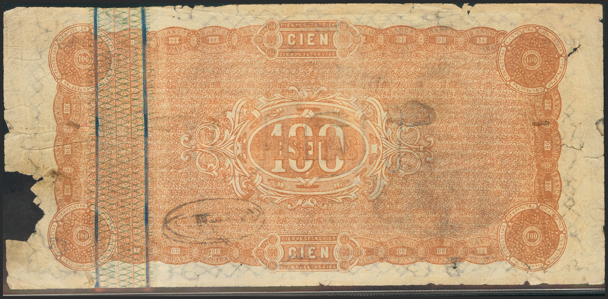100 Pesetas. 1 de Abril de 1880. FALSO DE EPOCA. Sin serie. (Edifil 2021: 278F). Muy raro y atractivo billete. BC+.