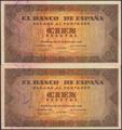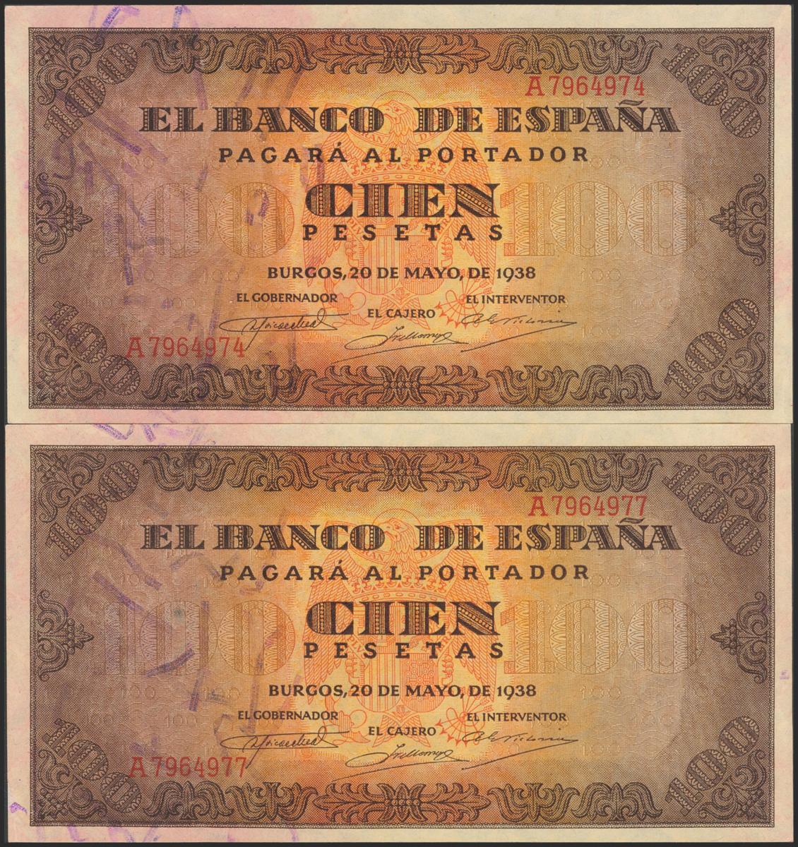 100 Pesetas. 20 de Mayo de 1938. Banco de España, Burgos, pareja casi correlativa. Serie A. Apresto original. (Edifil 2017: 432). EBC+.