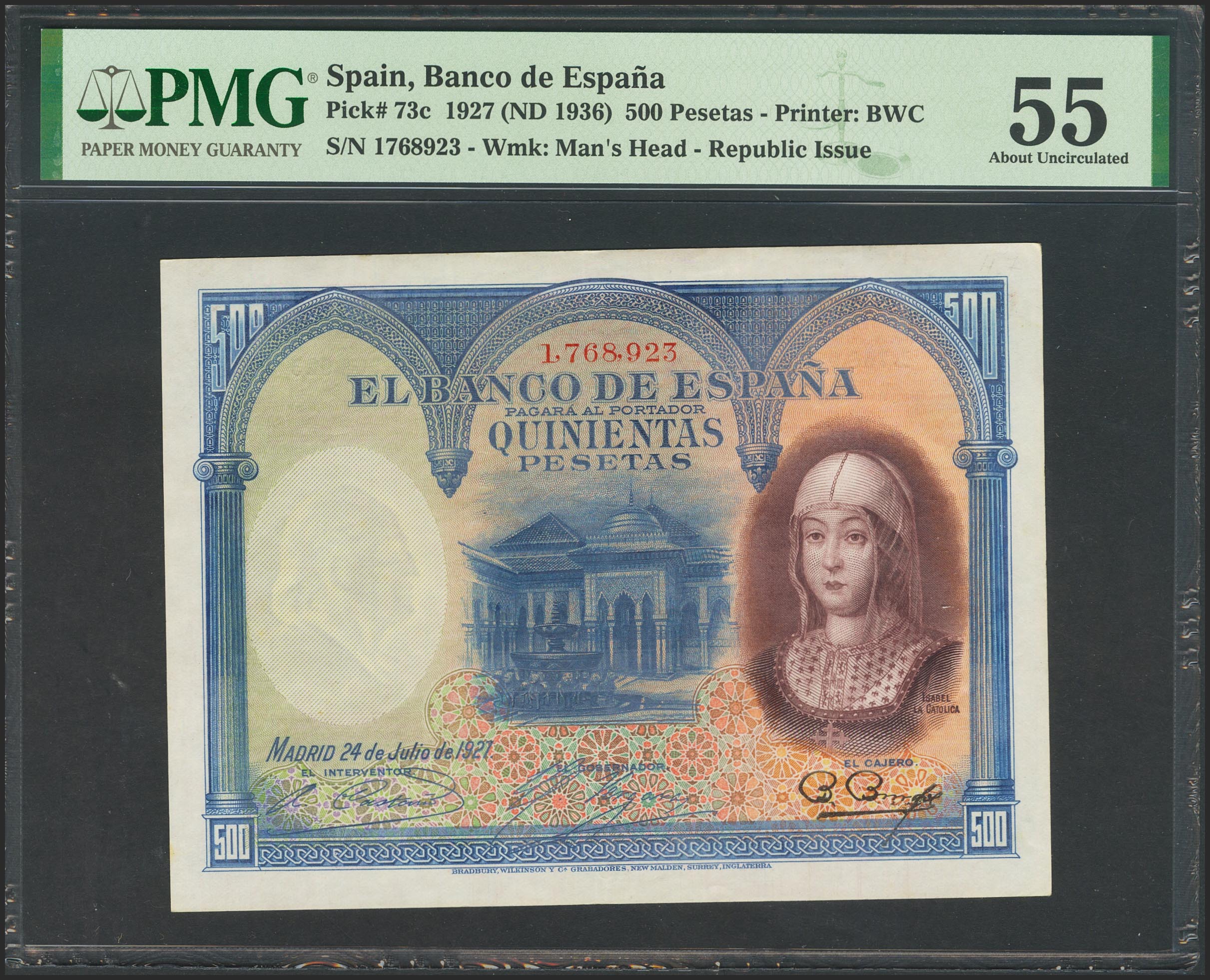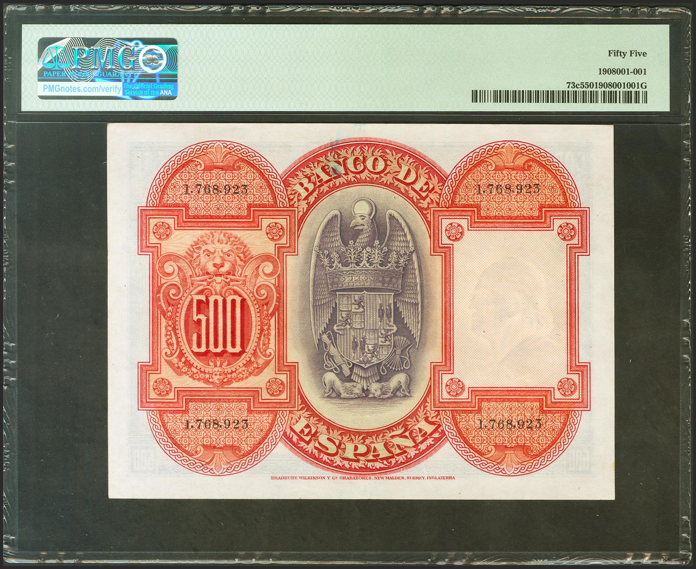 500 Pesetas. 24 de Julio de 1927. Sin serie y numeración posterior a 1602000. (Edifil 2017: 352). Muy raro en esta conservación. EBC+. Encapsulado PMG55.