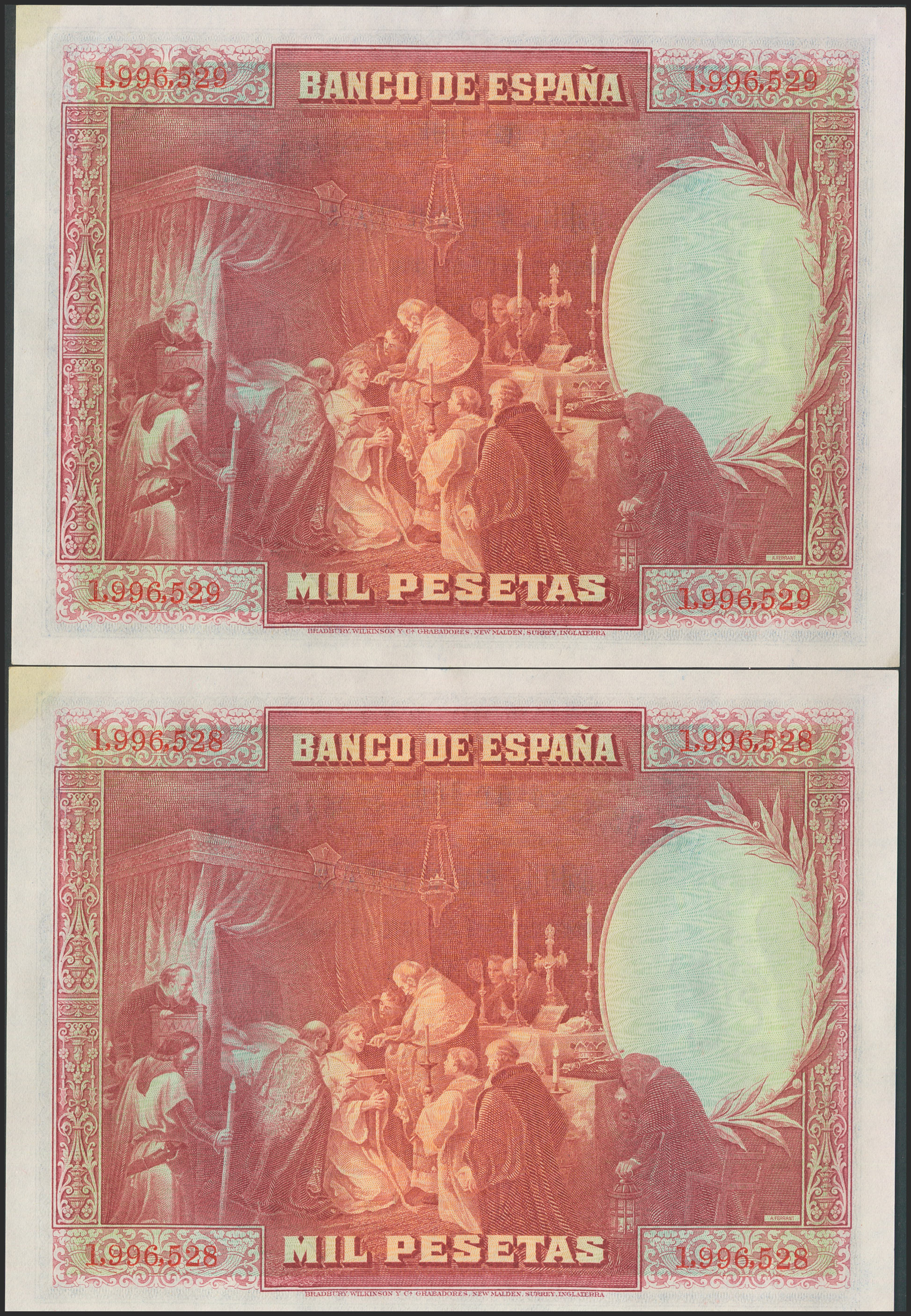 1000 Pesetas. 15 de Agosto de 1928. Pareja correlativa. Sin serie. (Edifil 2017: 357). Conserva todo su apresto original. SC-.