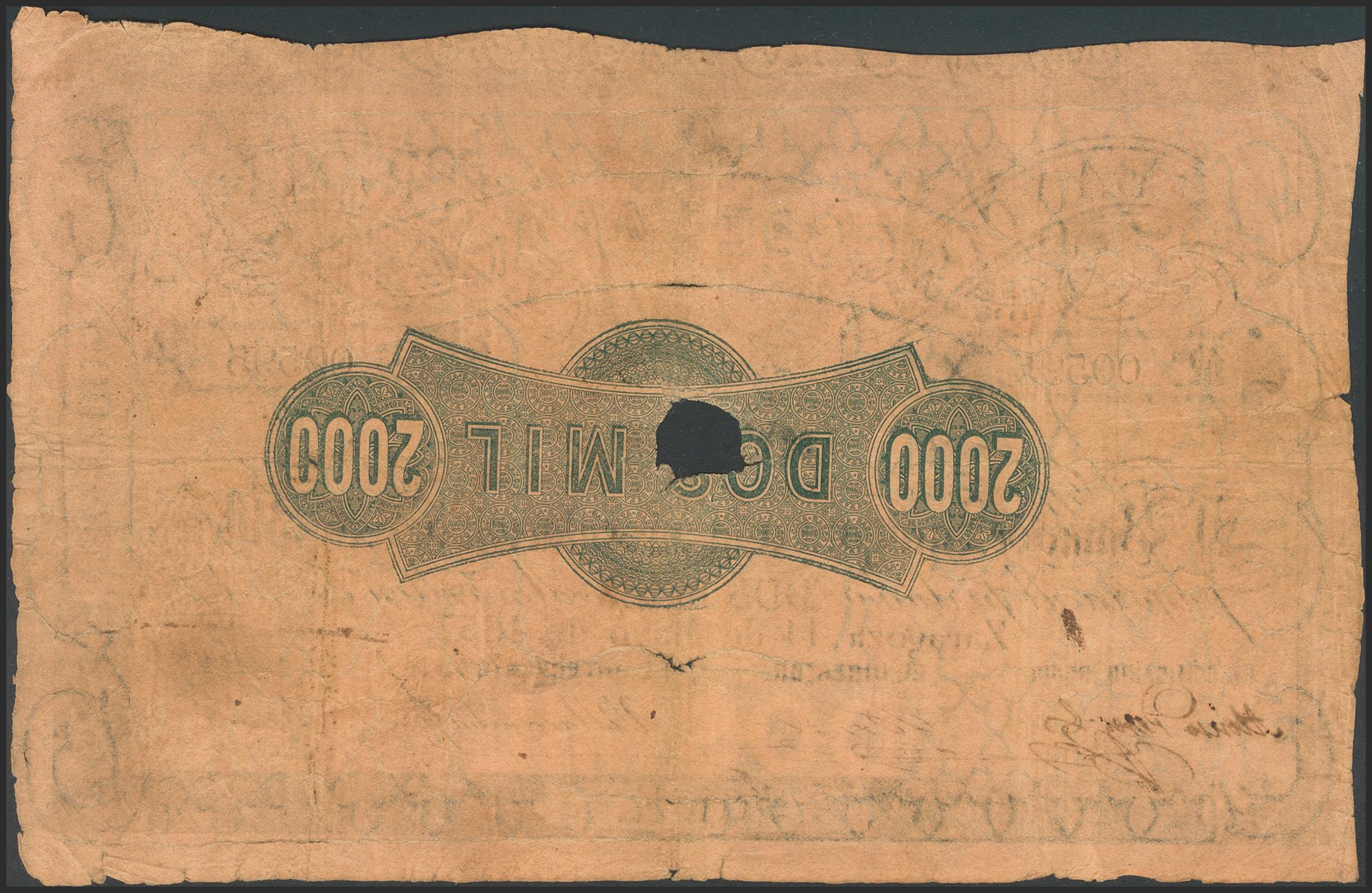 2000 Reales. 14 de Mayo de 1857. Banco de Zaragoza. Serie E. Con taladro y sin firmas. (Edifil 2021: 130A). Raro. MBC+.