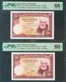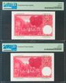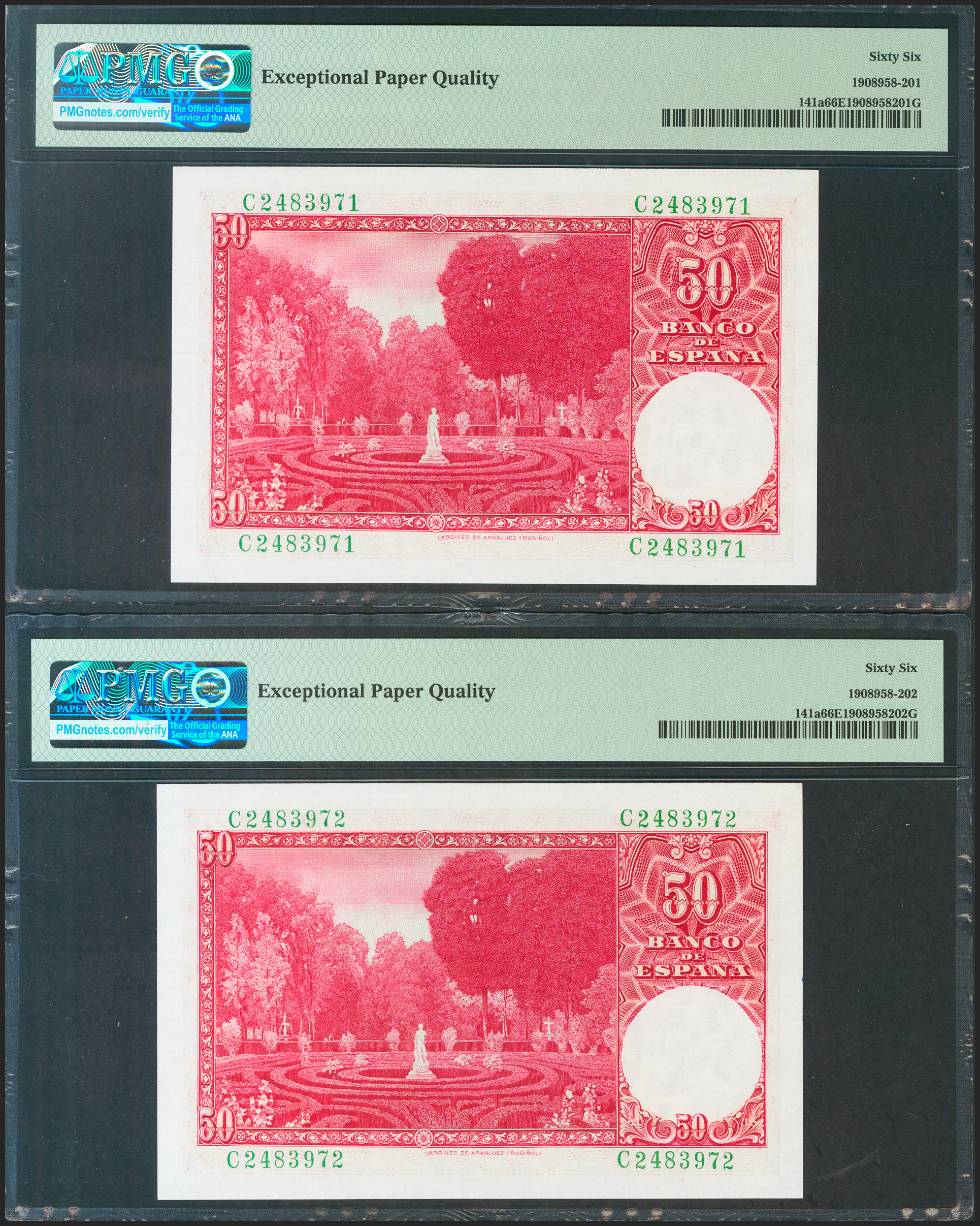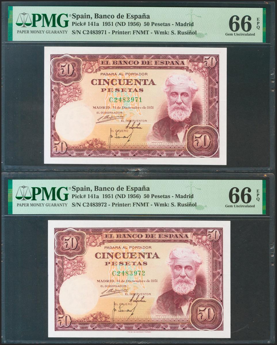 50 Pesetas. 31 de Diciembre de 1951. Pareja correlativa. Serie C. (Edifil 2021: 462a, Pick: 141a). RarÃsima en esta calidad, apresto original. SC. Encapsulado PMG66EPQ, ambos.