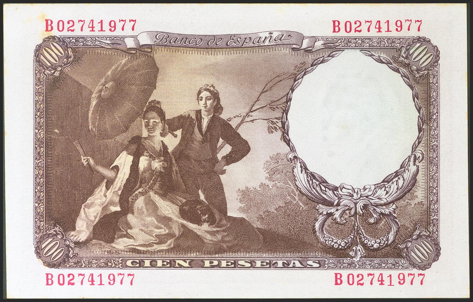 100 Pesetas. 19 de Febrero de 1946. Serie B, última serie emitida. (Edifil 2021: 451a). Apresto original, ligerÃsimas manchitas del tiempo. SC--.