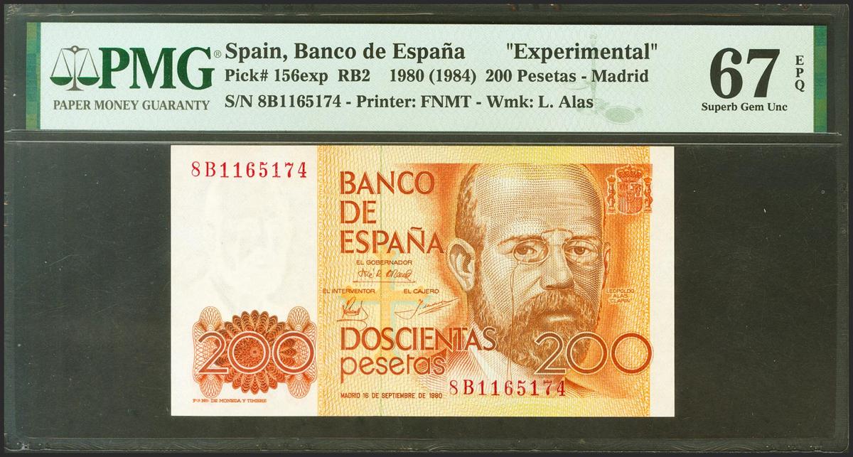 200 Pesetas. 16 de Septiembre de 1980. Serie especial 8B. (Edifil 2021: 480c, Pick: 156exp). Extraordinariamente raro en esta excepcional calidad. SC. Encapsulado PMG67EPQ.