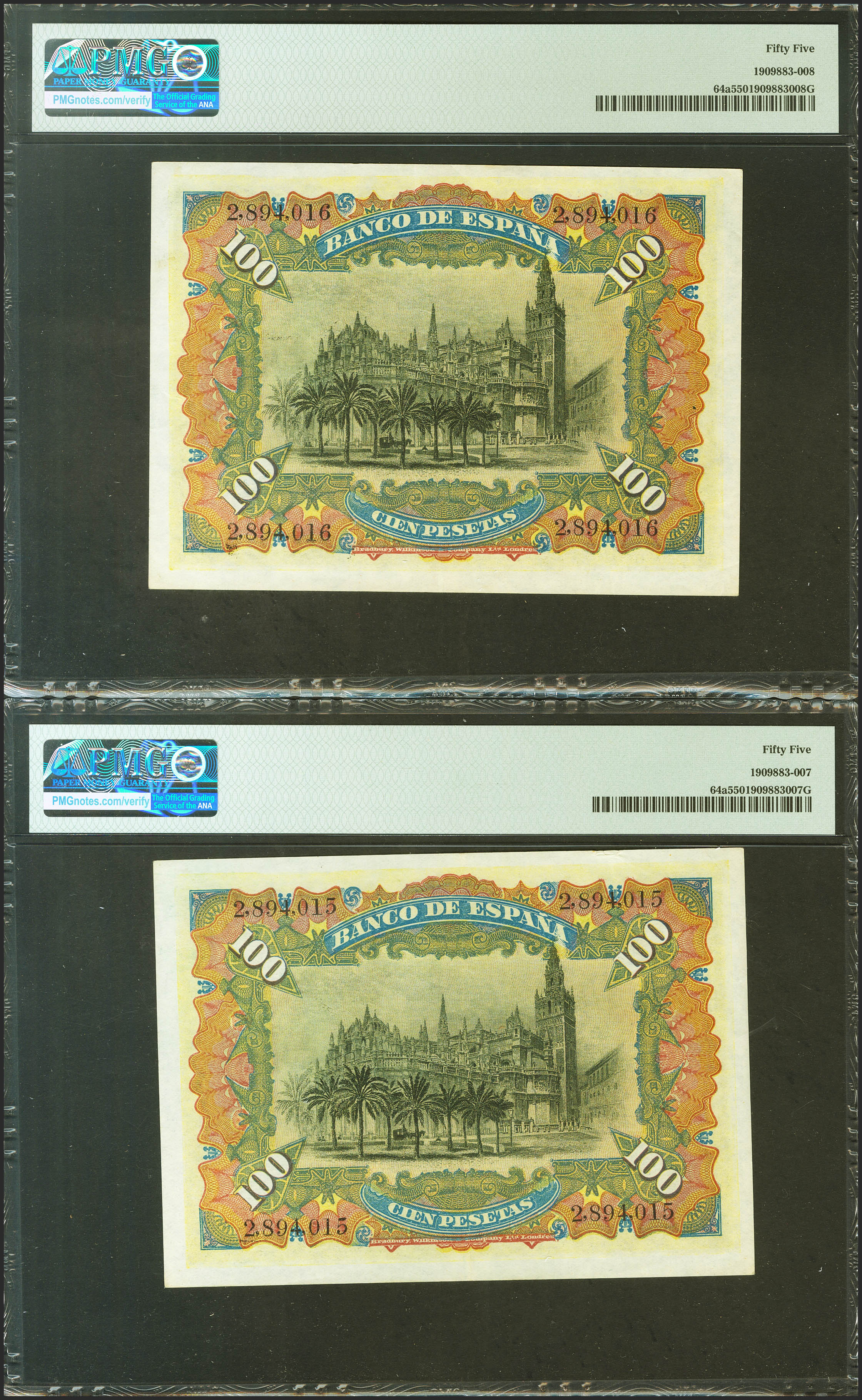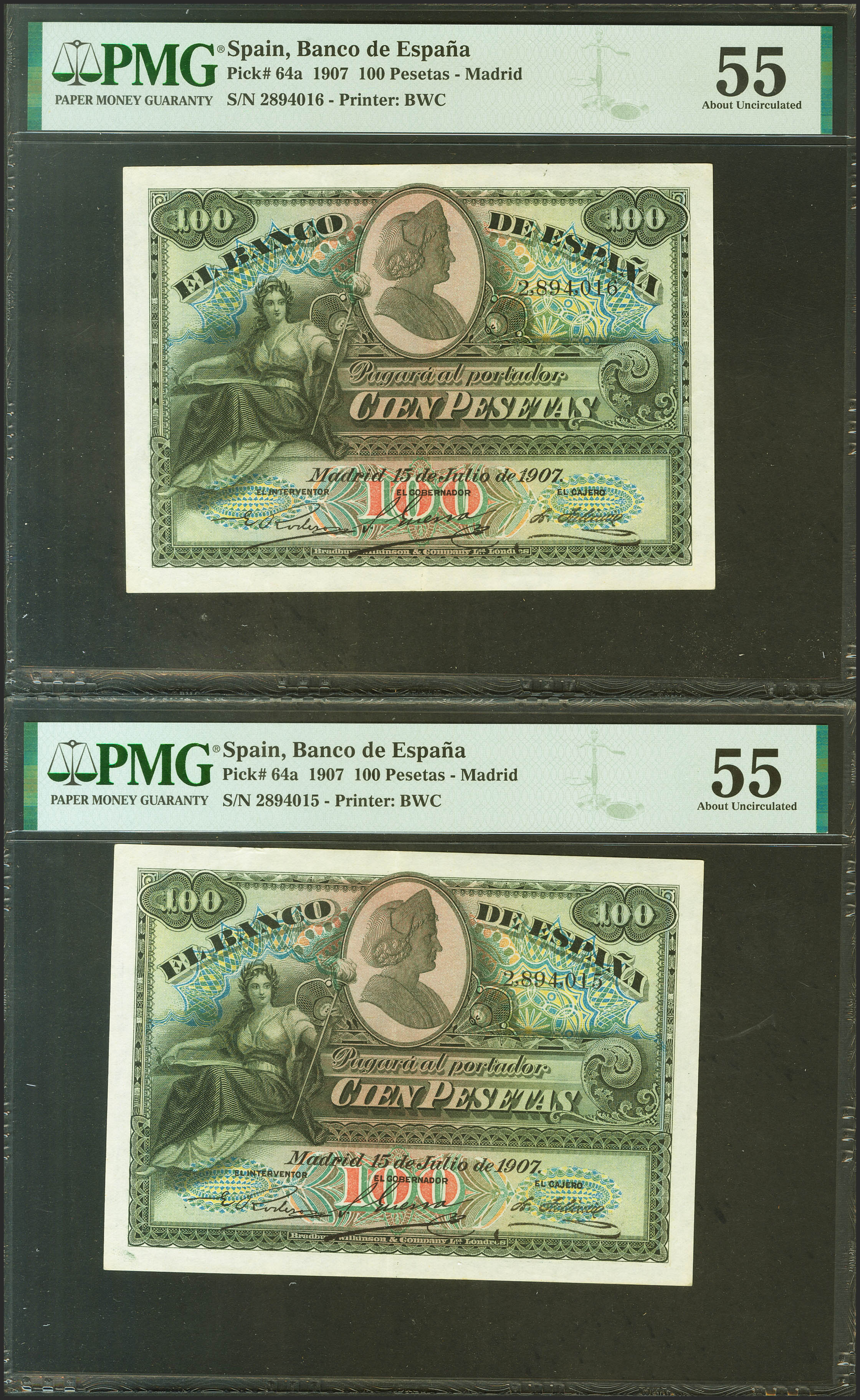 100 Pesetas. 15 de Julio de 1907. Pareja correlativa. Sin serie. (Edifil 2021: 320, Pick: 64a). Inusual en esta calidad. EBC+. Encapsulado PMG55, ambos.