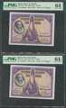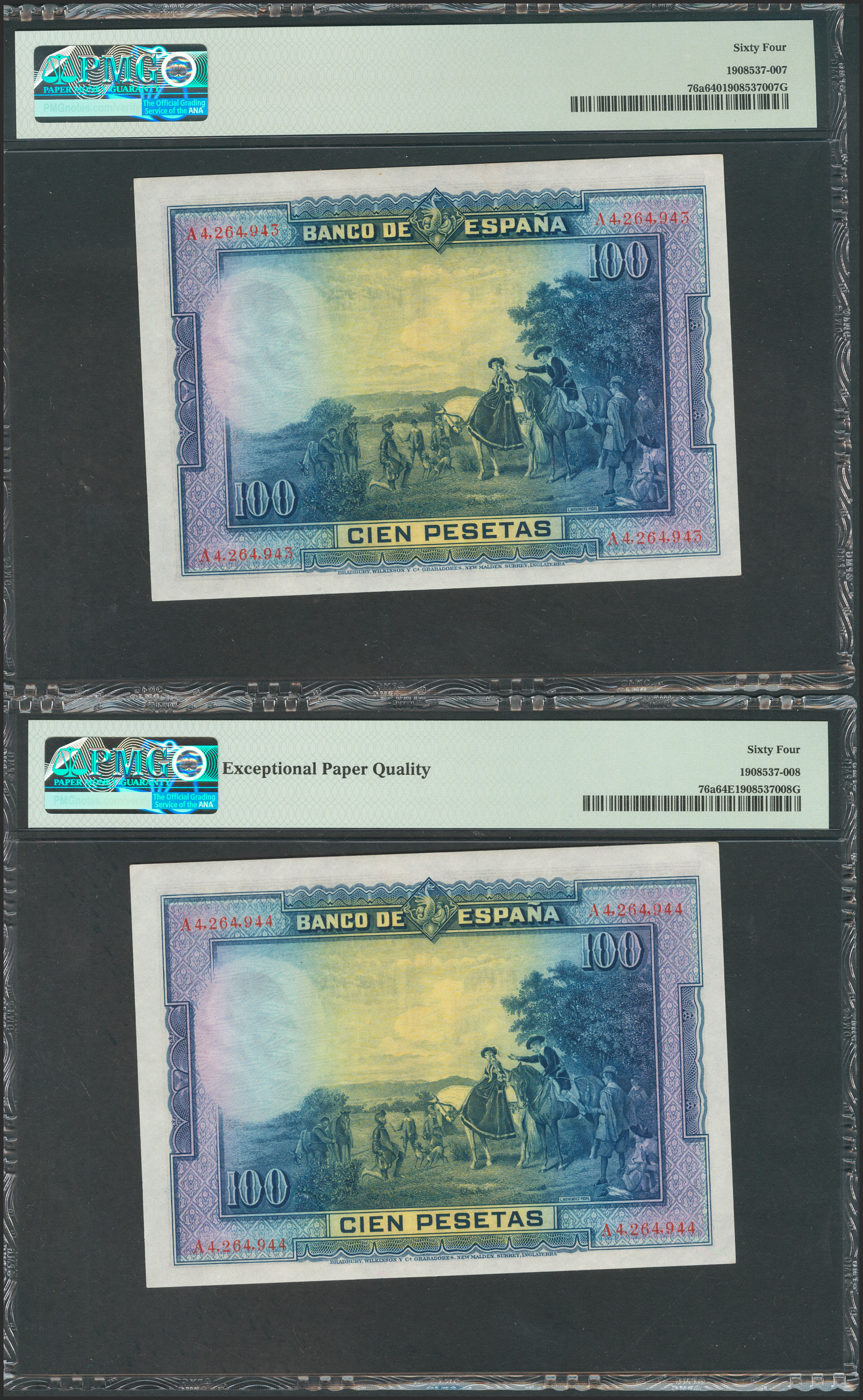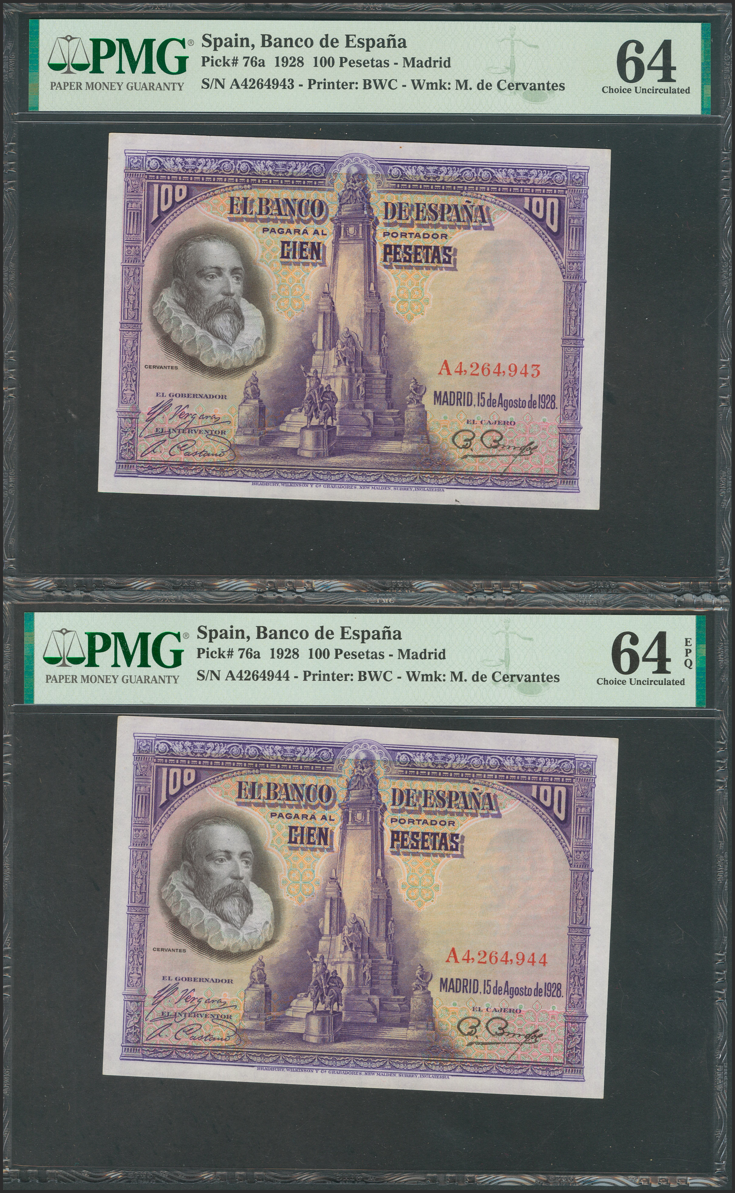 100 Pesetas. 15 de Agosto de 1928. Pareja correlativa. Serie A. (Edifil 2017: 355a). SC. Encapsulados PMG64/64EPQ.