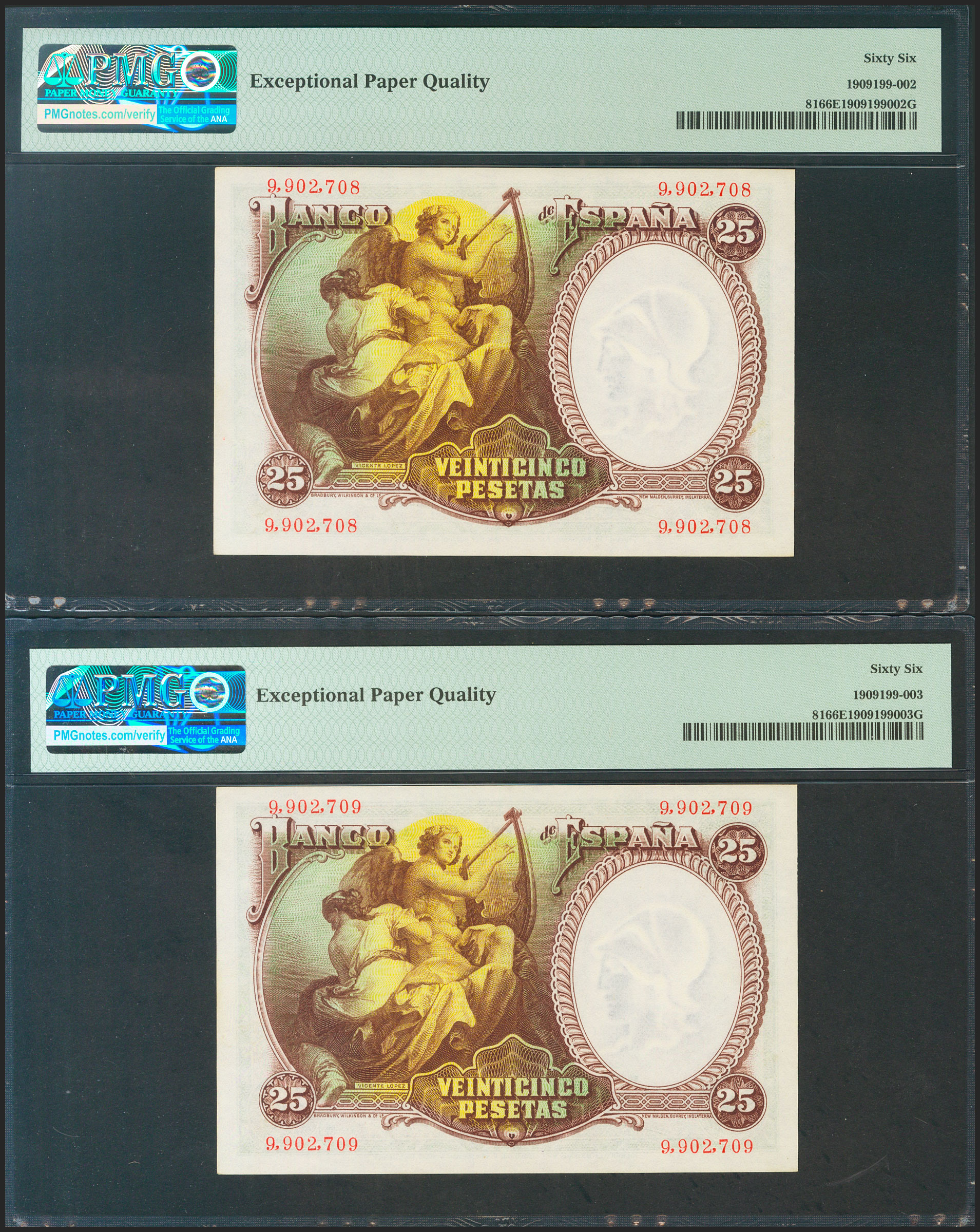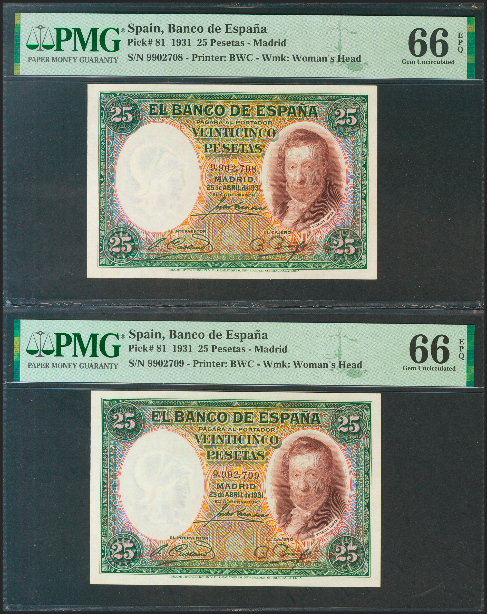25 Pesetas. 25 de Abril de 1931. Pareja correlativa. Sin serie. (Edifil 2021: 358, Pick: 81). Muy rara en esta calidad y con apresto original. SC. Encapsulado PMG66EPQ, ambos.