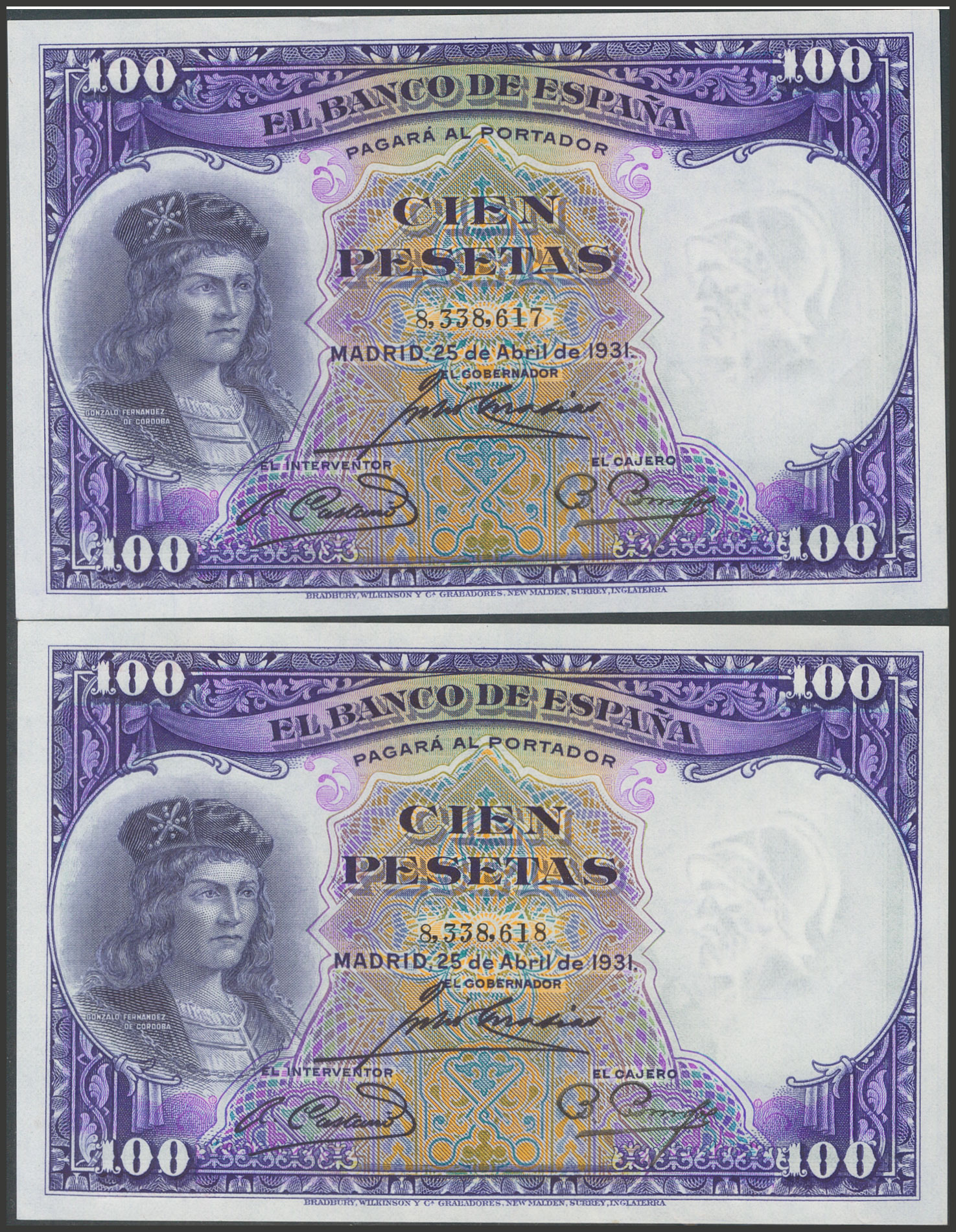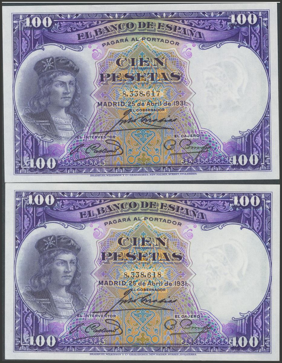 100 Pesetas. 25 de Abril de 1931. Pareja correlativa. Sin serie. (Edifil 2017: 360). Conserva todo su apresto original. SC-.