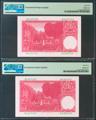 50 Pesetas. 31 de Diciembre de 1951. Pareja correlativa. Serie B. (Edifil 2021: 462a, Pick: 141a). Rara en esta calidad, apresto original. SC. Encapsulado PMG65EPQ, ambos.