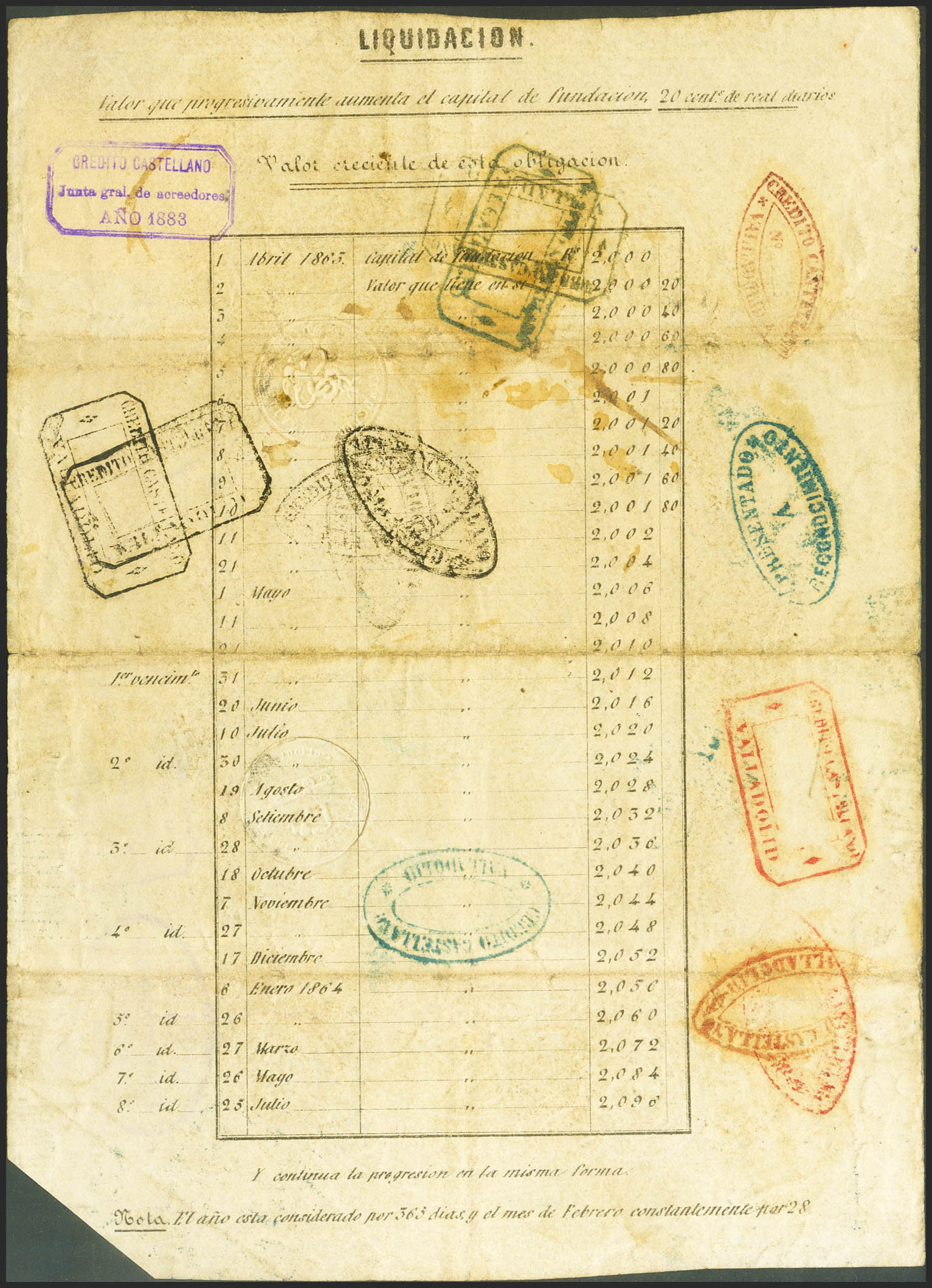 CREDITO CASTELLANO. 2012 Reales de Vellón. 1 de Abril de 1863. Serie C y diversas marcas de uso interno del Banco de Valladolid. RarÃsimo. Para entender mejor la contextualización de este billete recomendamos la obra "Obligaciones, vales y documentos puestos en circulación como papel moneda en España", de Don Ramón Cobo Huici. MBC.