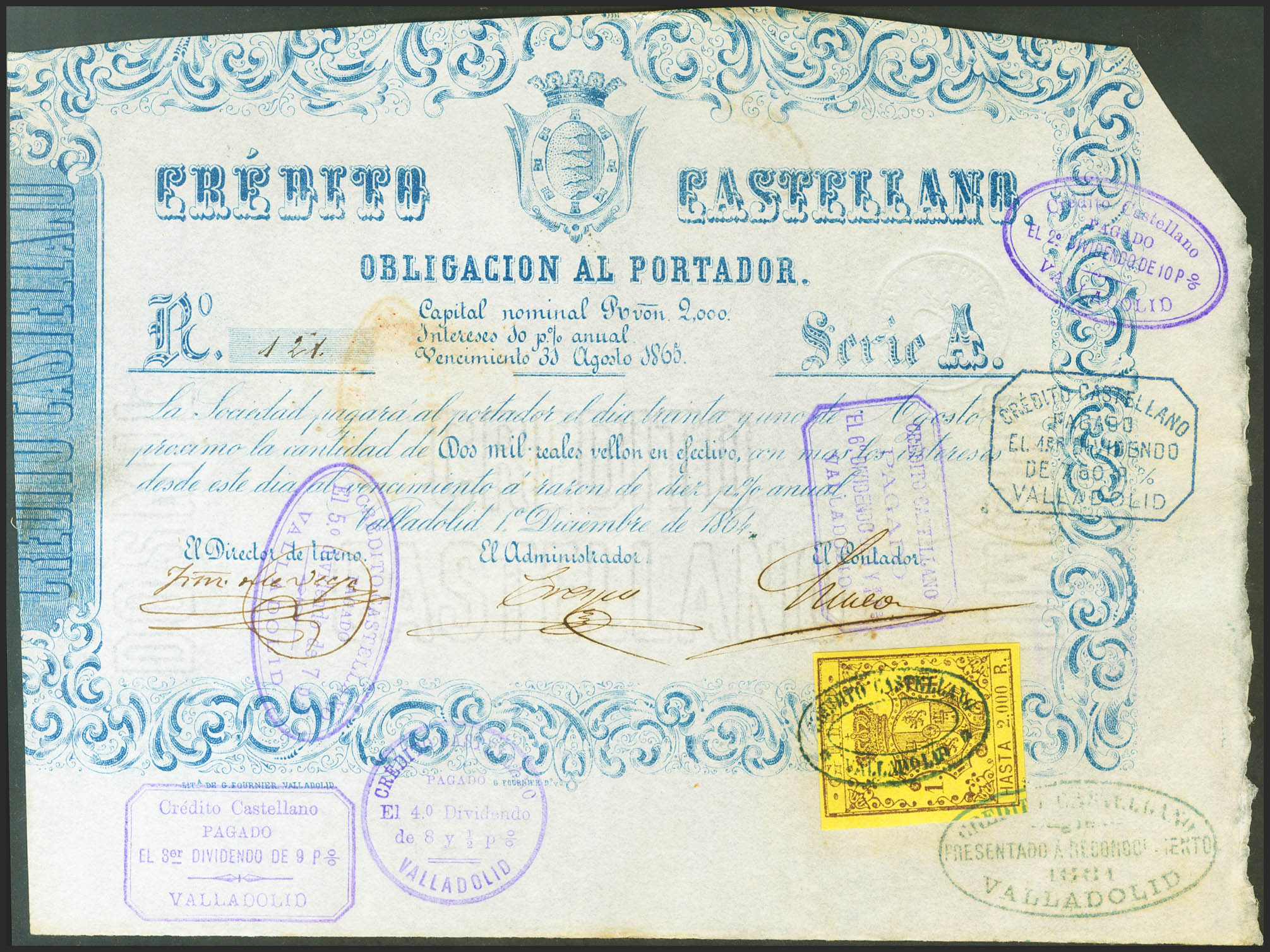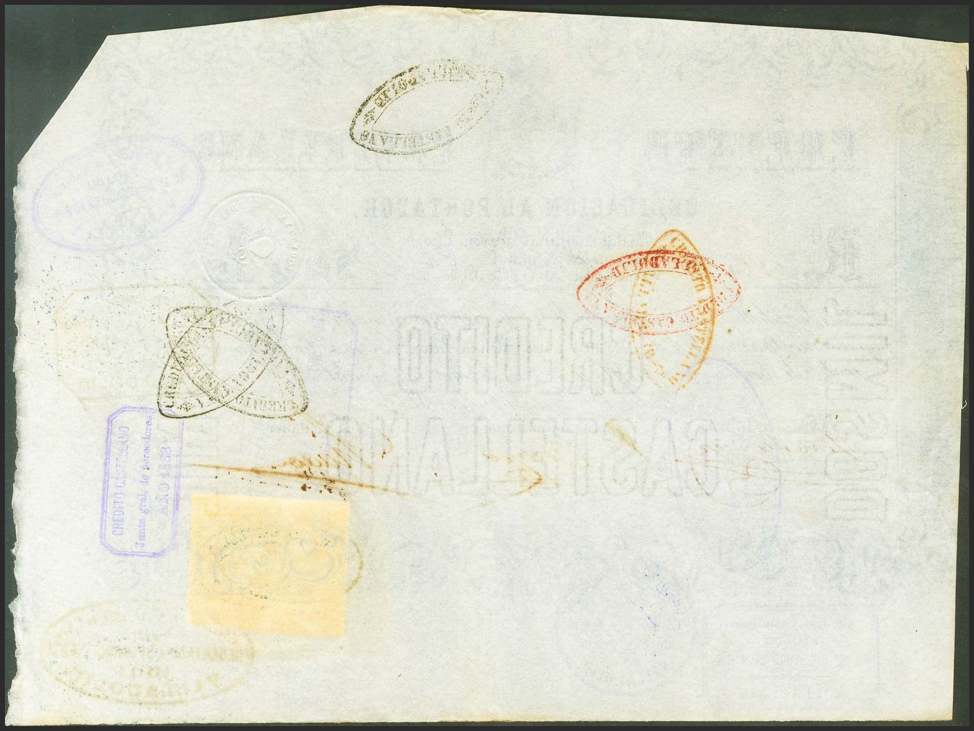 CREDITO CASTELLANO. 2000 Reales de Vellón. 31 de Agosto de 1865. Serie A y diversas marcas de uso interno del Banco de Valladolid. RarÃsimo. Para entender mejor la contextualización de este billete recomendamos la obra "Obligaciones, vales y documentos puestos en circulación como papel moneda en España", de Don Ramón Cobo Huici. EBC.