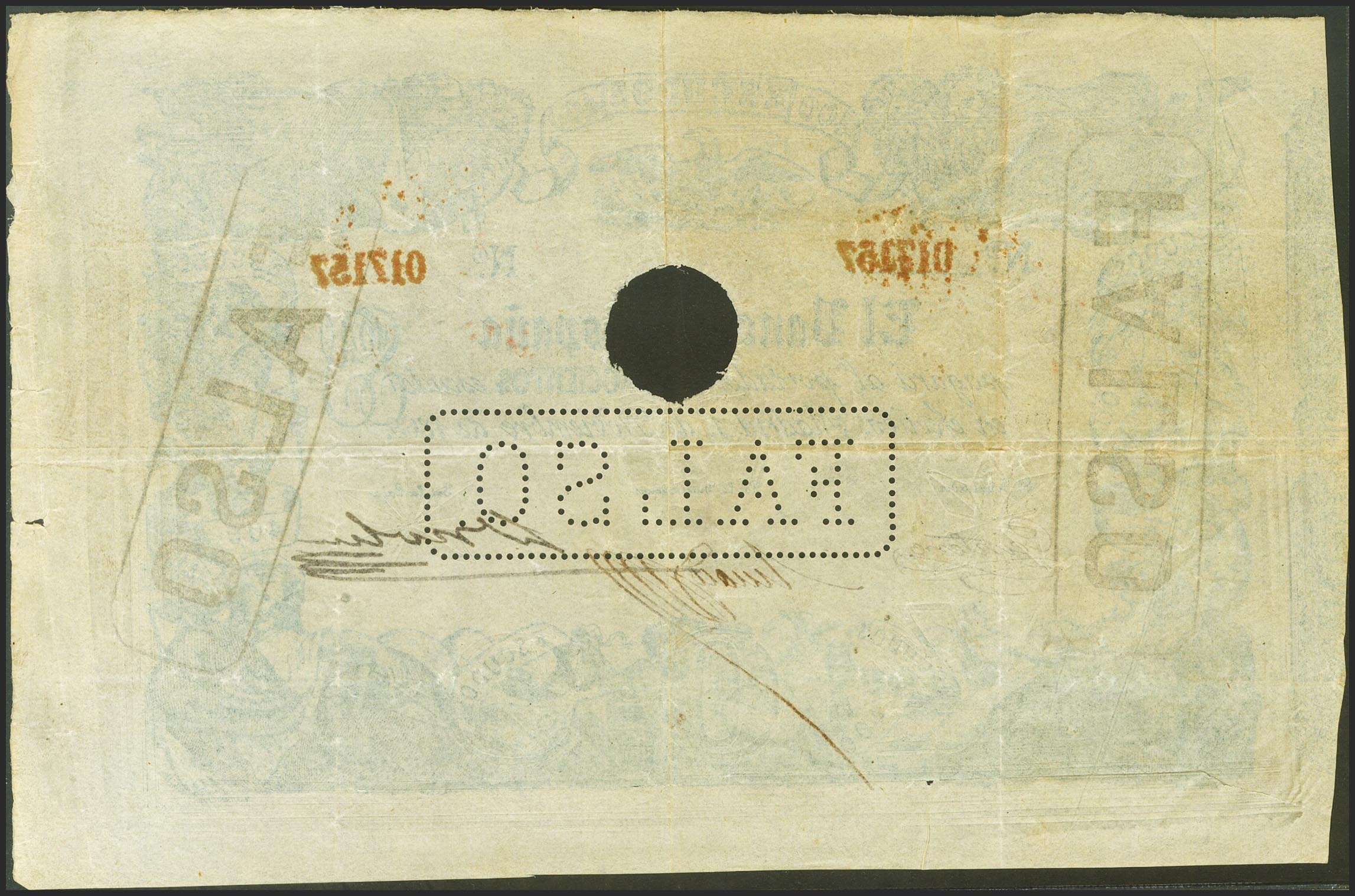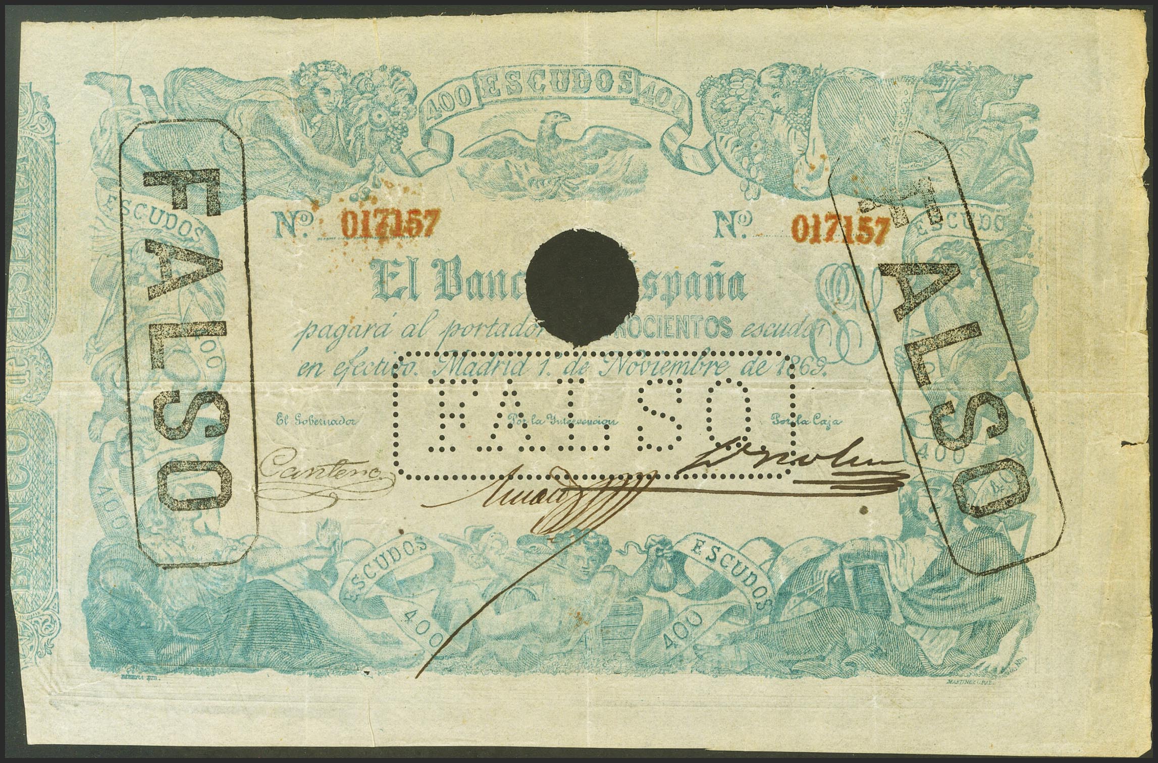 400 Escudos. 1 de Noviembre de 1869. Falso de Epoca. Sin serie y taladrado (como todos los conocidos) y con la marca FALSO. (Edifil 2021: 239F). RarÃsimo. MBC+. Ex-Florián Ruiz.