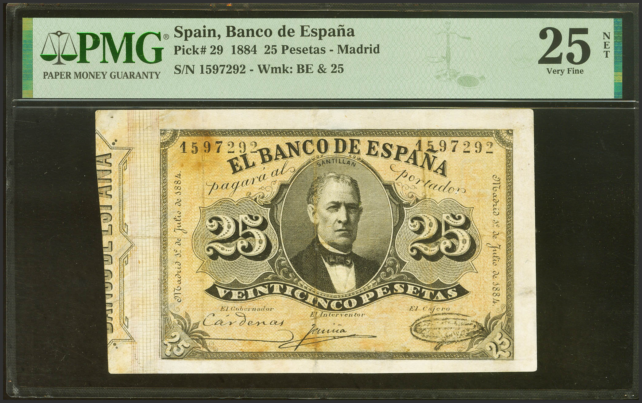 25 Pesetas. 1 de Julio de 1884. Sin serie. (Edifil 2021: 287, Pick: 29). Raro, reparado. MBC. Encapsulado PMG25NET (repaired).