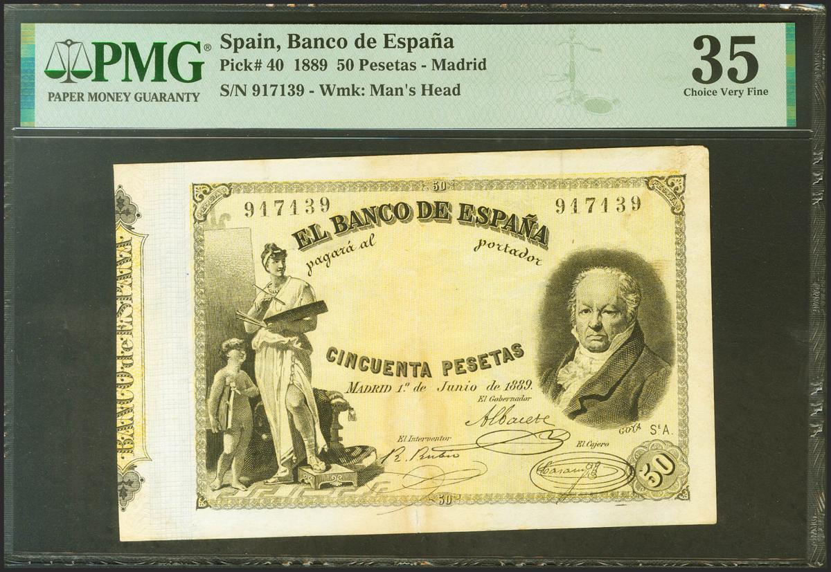 50 Pesetas. 1 de Junio de 1889. Serie A. (Edifil 2021: 298, Pick: 40). Muy raro especialmente sin reparaciones y en esta calidad, roturita sin importancia alguna en el margen inferior del doblez central. MBC+. Encapsulado PMG35 (stains, tear).