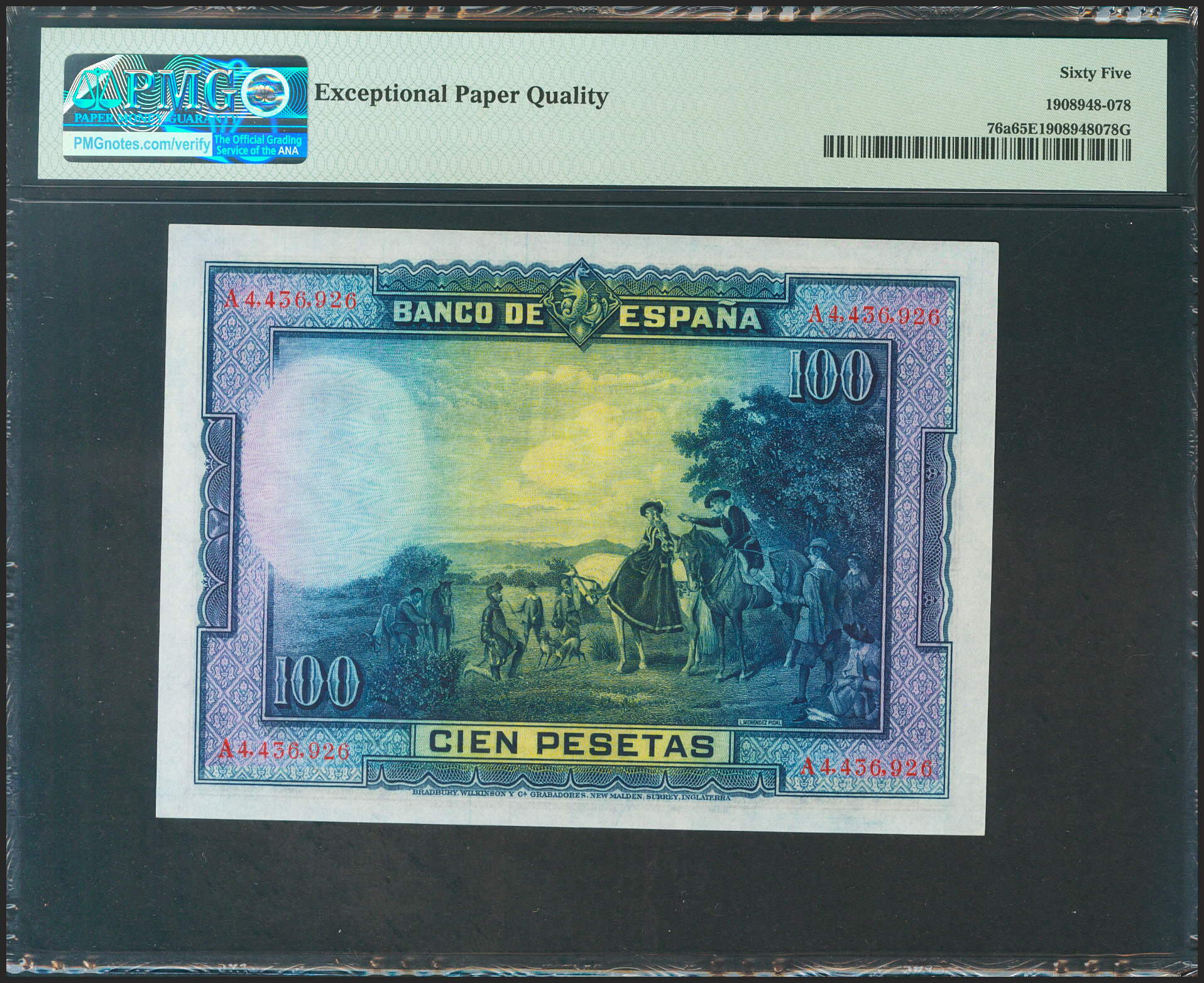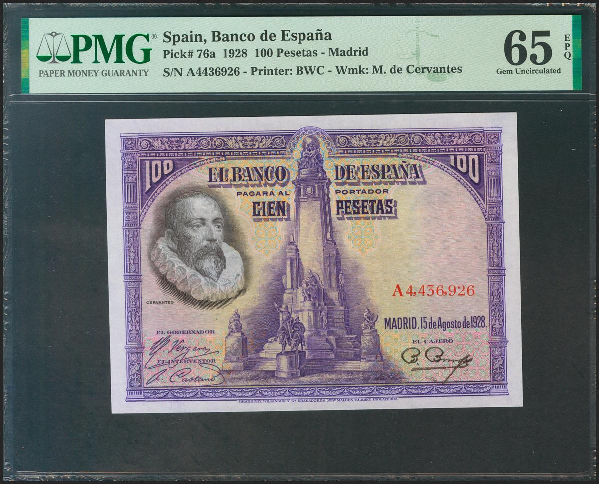 100 Pesetas. 15 de Agosto de 1928. Serie A. (Edifil 2021: 355a, Pick: 76a). Raro en esta calidad y con apresto original. SC. Encapsulado PMG65EPQ.