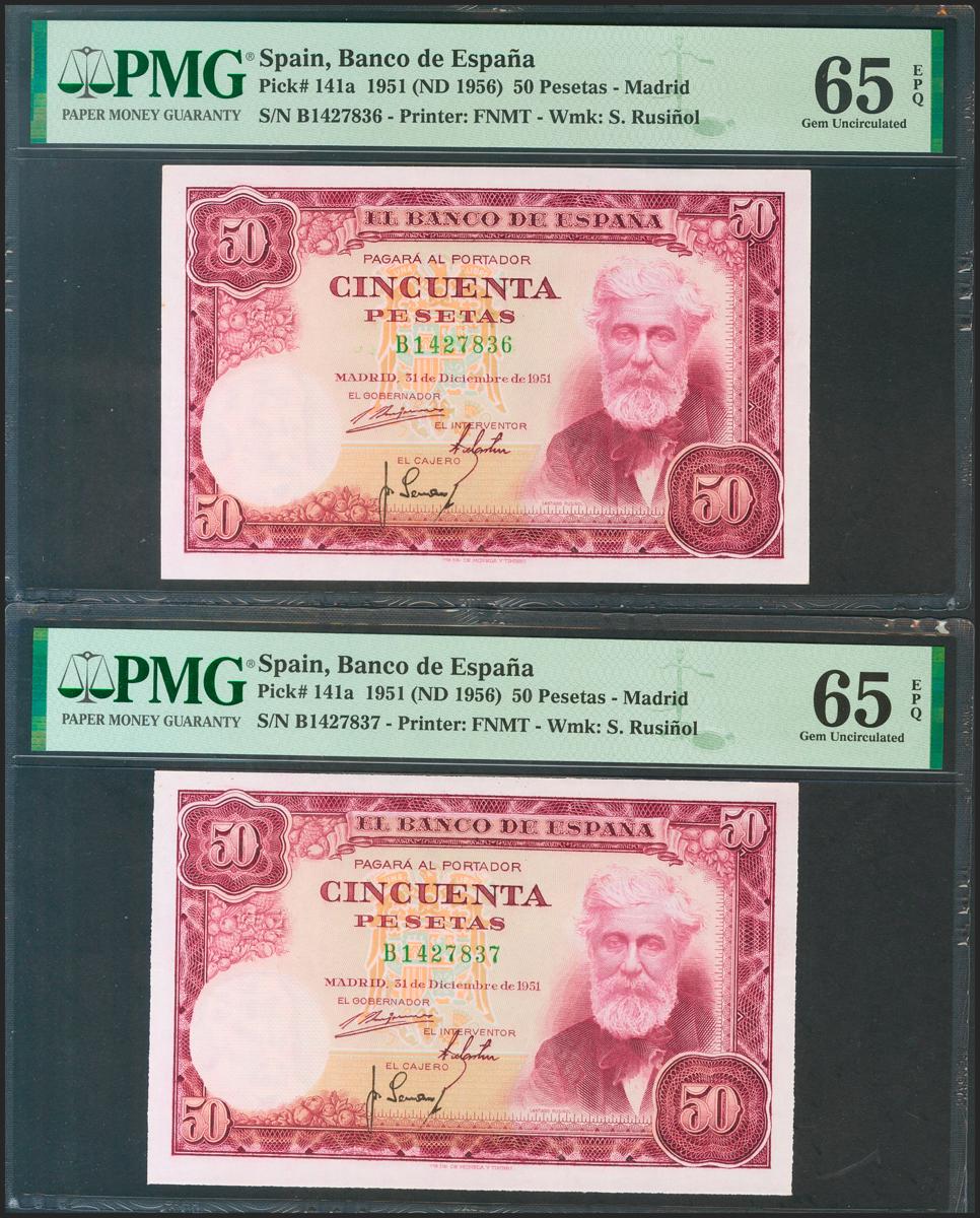 50 Pesetas. 31 de Diciembre de 1951. Pareja correlativa. Serie B. (Edifil 2021: 462a, Pick: 141a). Rara en esta calidad, apresto original. SC. Encapsulado PMG65EPQ, ambos.